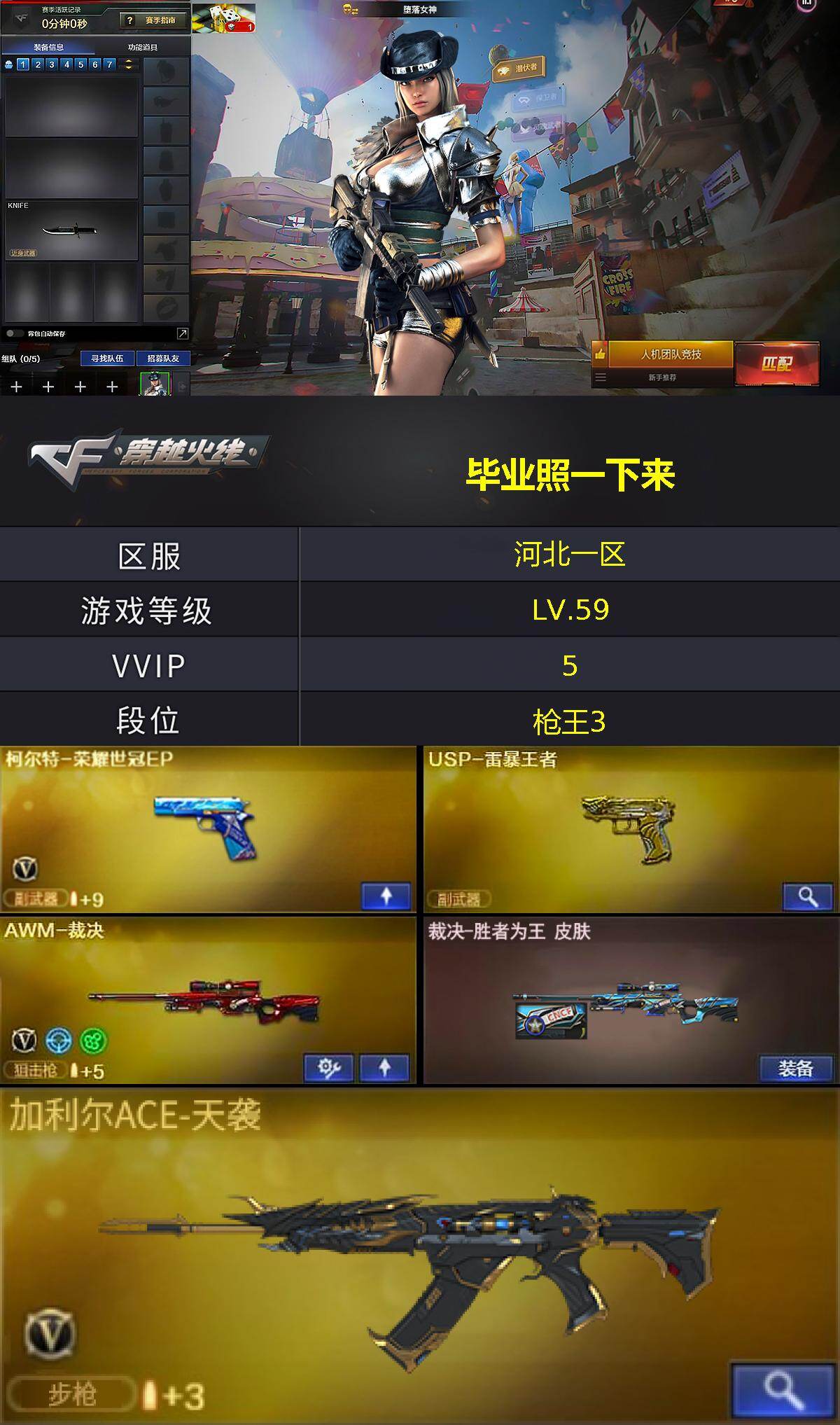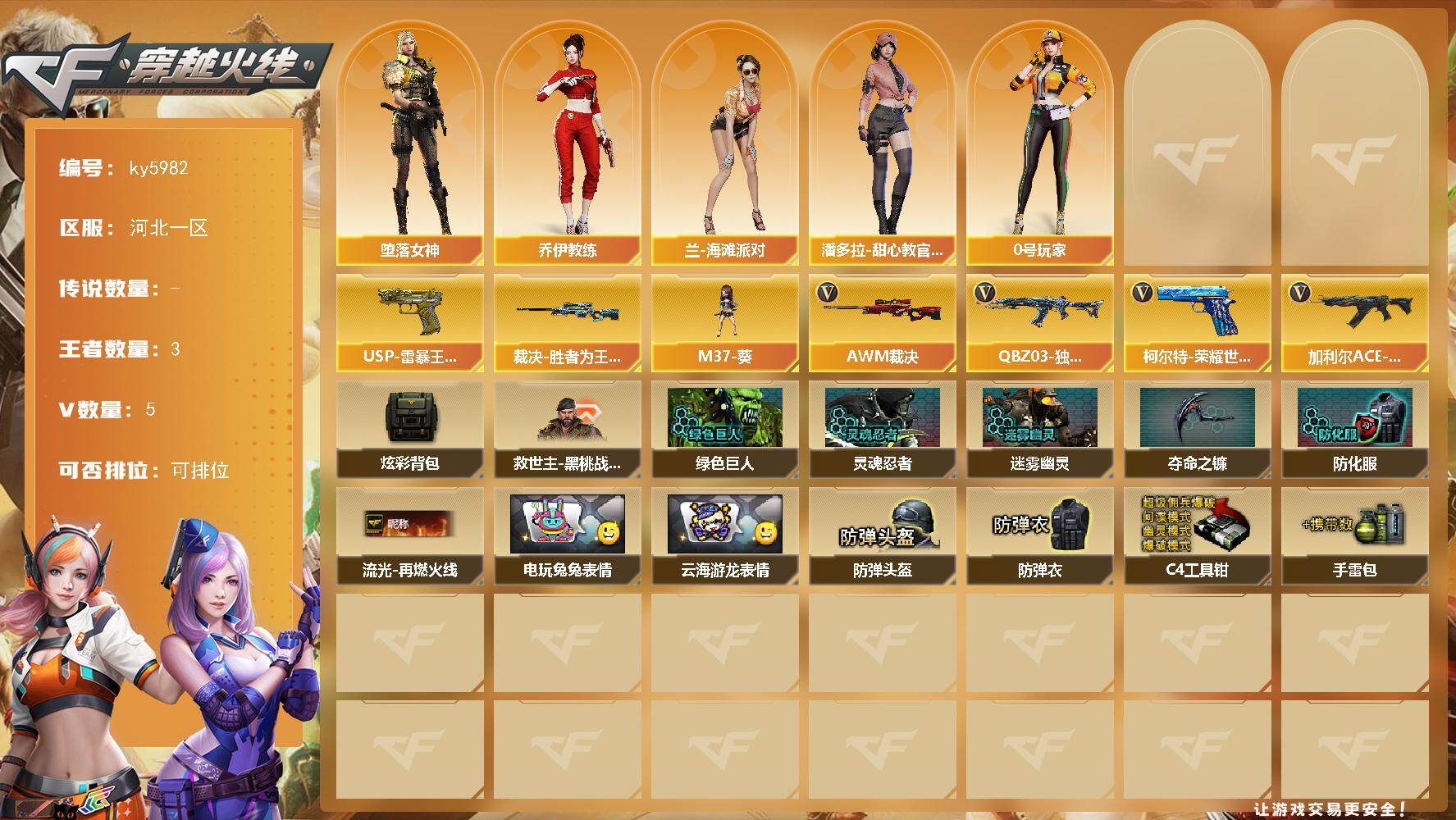 [17180081]河北一区-9V-3王者武器数-0炫金武器数 【王者炫金武器】:USP-雷暴王者 【皮肤】:裁决-胜者为王 皮肤 【角色】:堕落女神,乔伊教练,兰-海滩派对,0号玩家,潘多拉-甜心教官 【人偶武器】:M37-葵 【英雄级武器】:QBZ03-独角-III,加利尔ACE-天袭,AWM-裁决,柯尔特-荣耀世冠EP 【道具】:炫彩背包,救世主-黑桃战神,绿色巨人,灵魂忍者,迷雾幽灵,夺命之镰,防化服*2,流光-再燃火线,电玩兔兔表情,云海游龙表情,防弹头盔*2,防弹衣*2,C4工具钳*2,手雷包*2 【特殊枪械】: