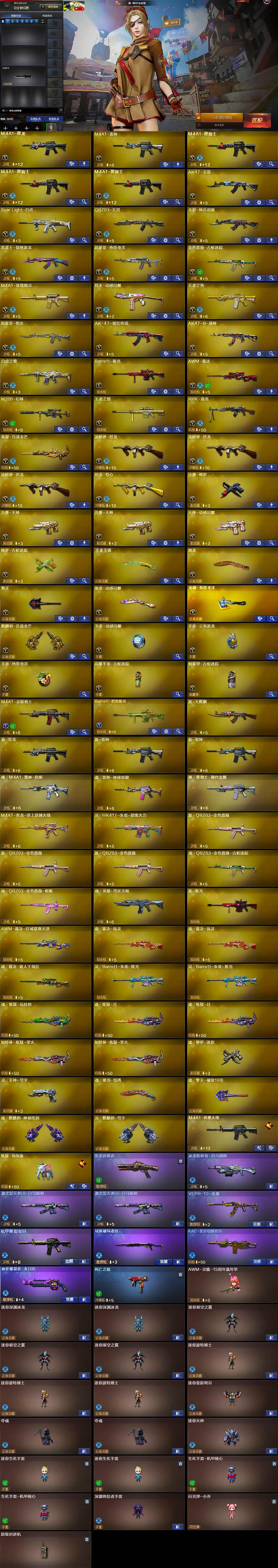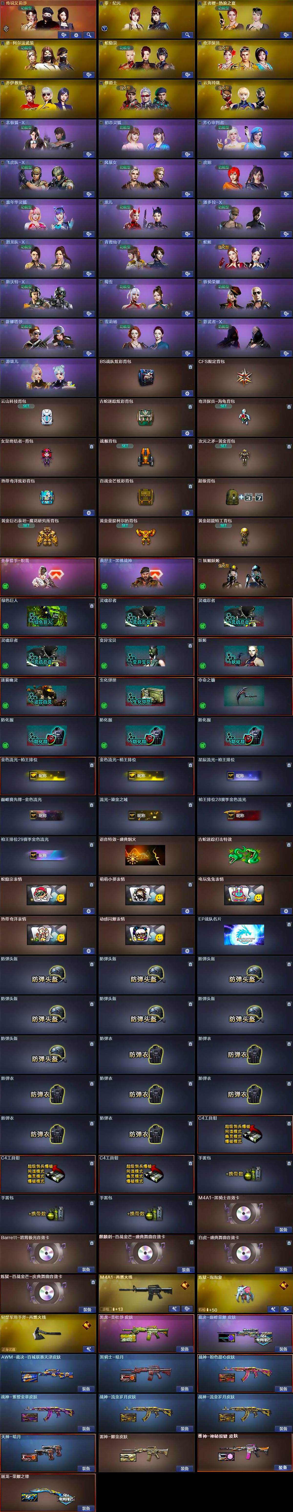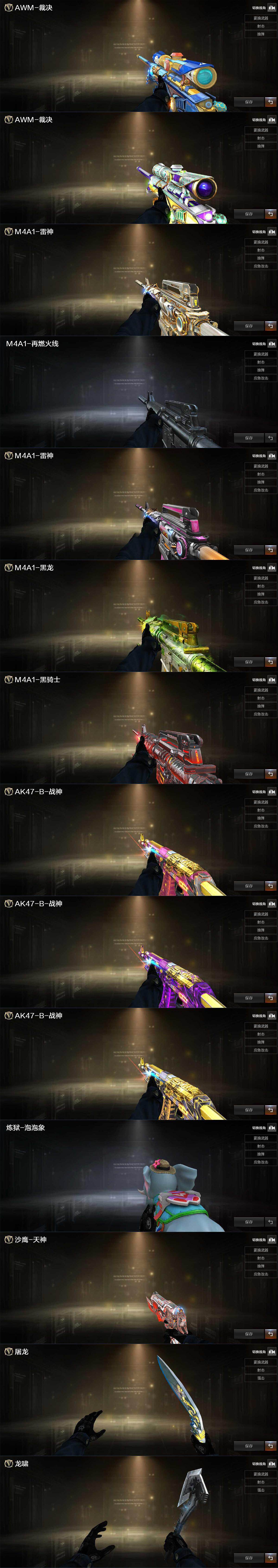【英雄级武器】:M4A1-黑龙,M4A1-雷神,M4A1-黑骑士*3,AK47-无影,Scar Light-白虎,QBZ03-天罚,无影-神兵利器,黑武士-锦绣游龙,超新星-热带奇洋,金色蔷薇-古蛇迷踪,M4A1-玫瑰精灵,烈火-动感闪耀,王者之势-觉醒版,超新星-悦享-觉醒版,AK-47-猩红传说,AK47-B-战神,白虎之魄-觉醒版,Barrett-极光,AWM-裁决,M200-幻神,王者之怒-觉醒版,RPK-盘龙,炼狱-百战金芒,汤姆逊-烈龙*3,烈龙-悦心-觉醒版,沙鹰-修罗,沙鹰-天神*2,天神-动