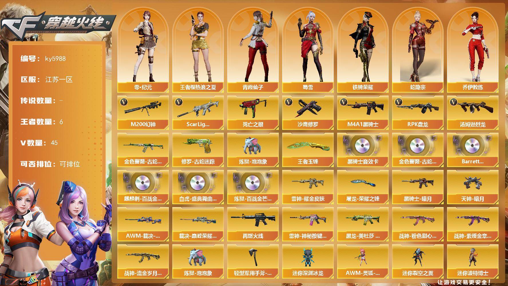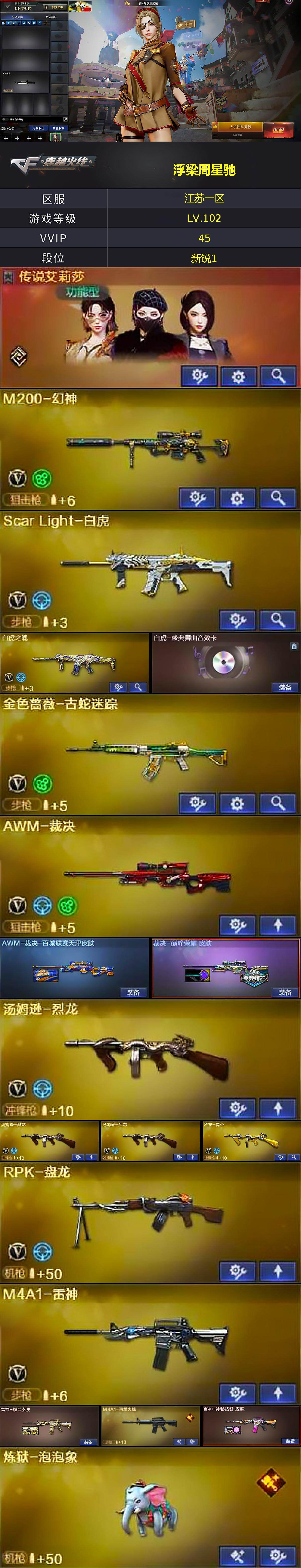 [17130390]江苏一区-49V-6王者武器数-0炫金武器数 【传说角色】:传说艾莉莎 【热门武器】:Scar Light-白虎,M200-幻神,金色蔷薇-古蛇迷踪,修罗-古蛇迷踪,死亡之眼,M4A1-黑骑士*3,汤姆逊-烈龙*3,RPK-盘龙,炼狱-泡泡象,沙鹰-修罗 【王者炫金武器】:王者玉锋 【音效卡】:M4A1-黑骑士音效卡,QBZ03-金色蔷薇-古蛇迷踪音效卡,Barrett-碧霄极光音效卡,麒麟刺-百战金芒-盛典舞曲音效卡,白虎-盛典舞曲音效卡,炼狱-百战金芒-庆典舞曲音效卡 【皮肤】:AWM-裁决-百城联赛天津皮肤,裁决-巅峰荣耀 皮肤,雷神-耀金皮肤,M4A1-再燃火线,雷神-神秘按键 皮肤,黑龙-美杜莎 皮肤,黑骑士-暗月,战神-粉色甜心皮肤,战神-紫绶金章皮肤,战神-流金岁月皮肤*2,炼狱-泡泡象,天神-暗月,屠龙-荣耀之锋,轻型军用手斧-再燃火线 【角色】:零·纪元,王者樱-热浪之夏,蛇隐宗,奇洋探员,乔伊教练,修道士,云海玲珑,葵-阿尔法武装,北极狐-X,初恋灵狐,芳心审判者,飞虎队-X,风暴女,虎妞,嘉年华灵狐,龙儿,潘多拉-X,潜龙队-X,青霞仙子,蛇姬,斯沃特-X,蜀雪,铁骑荣耀,兔囡囡,新娜塔莎,雪莉杨,影武者-X,游珑儿 【人偶武器】:AWM-灵狐-15周年嘉年华,迷你深渊冰龙*2,迷你裂空之翼*3,迷你波特博士*3,迷你曼提柯尔,夺魂*2,迷你火种,迷你生化手雷*2,生化手雷-机甲核心*2,深渊终结者手雷,闪光弹-小乔 【暴走生化】:黑龙吞噬者,死亡之眼,超级对讲机 【挑战大师】:冰龙粉碎者-白马银枪,激光毁灭者III-白马银枪*2,VEPR-12-金魔,机甲撕裂者III,试炼破坏者III,KAC-圣炎切割者III,神圣爆裂者-末日III 【英雄级武器】:M4A1-黑龙,M4A1-雷神,M4A1-黑骑士*3,AK47-无影,Scar Light-白虎,QBZ03-天罚,无影-神兵利器,黑武士-锦绣游龙,超新星-热带奇洋,金色蔷薇-古蛇迷踪,M4A1-玫瑰精灵,烈火-动感闪耀,王者之势-觉醒版,超新星-悦享-觉醒版,AK-47-猩红传说,AK47-B-战神,白虎之魄-觉醒版,Barrett-极光,AWM-裁决,M200-幻神,王者之怒-觉醒版,RPK-盘龙,炼狱-百战金芒,汤姆逊-烈龙*3,烈龙-悦心-觉醒版,沙鹰-修罗,沙鹰-天神*2,天神-动