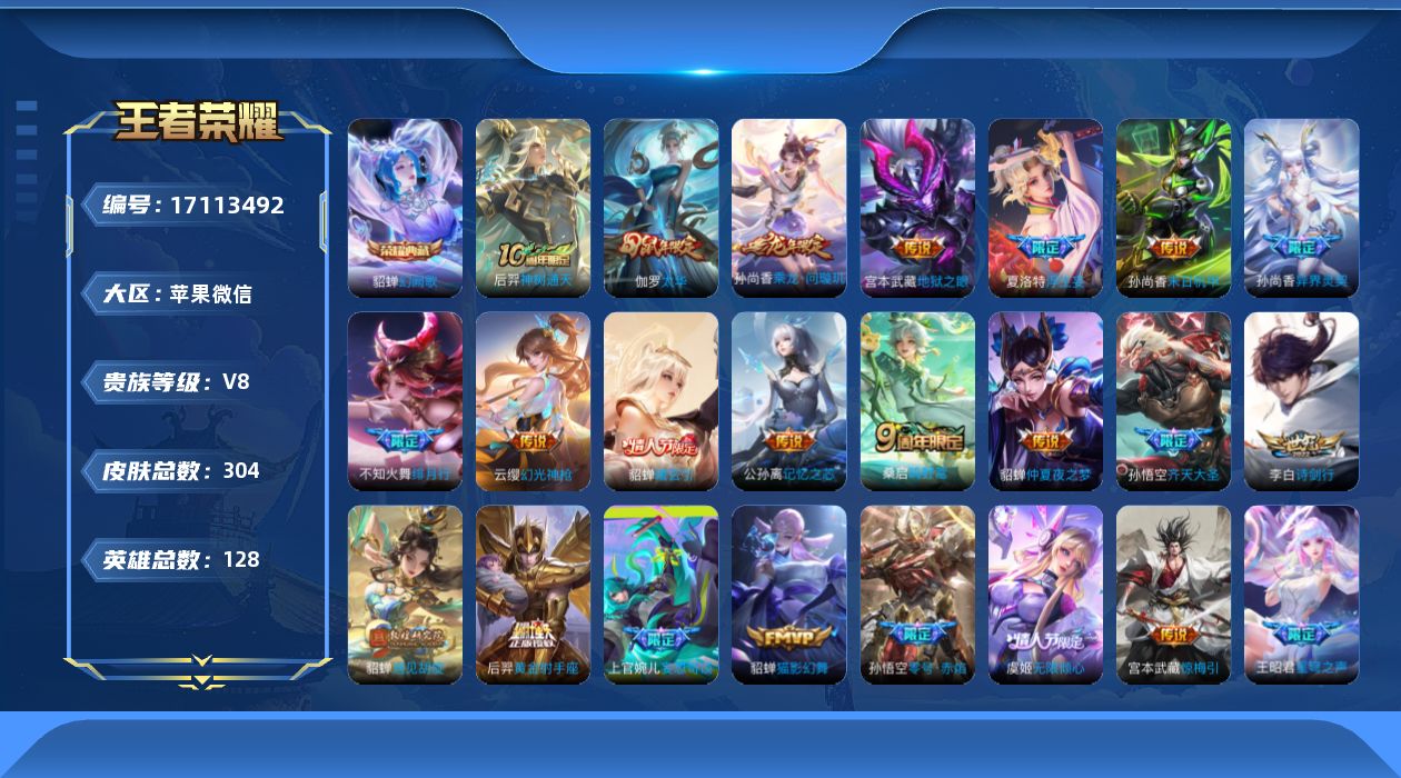 [17113492]苹果WX-V8-至尊星耀III段位-127英雄-296皮肤-1典藏皮肤-26传说-99史诗-3星传