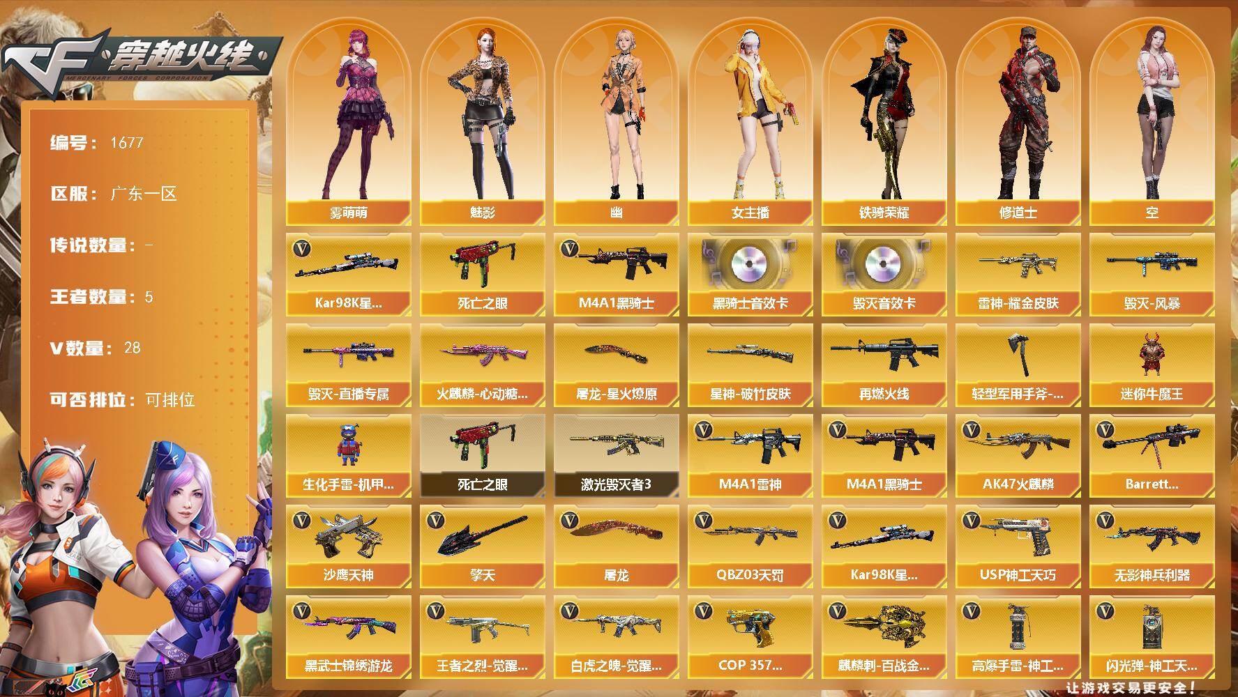 [16530717]广东一区-28V-5王者-0炫金 【传说角色】:传说影煞 【热门武器】:死亡之眼,Kar98K-星神,M4A1-黑骑士 【音效卡】:M4A1-黑骑士音效卡,Barrett-毁灭音效卡 【皮肤】:星神-破竹皮肤,雷神-耀金皮肤,M4A1-再燃火线,火麒麟-心动糖果,毁灭-风暴,毁灭-直播专属,屠龙-星火燎原,轻型军用手斧-再燃火线 【角色】:魅影,雾萌萌,修道士,空,北极狐-X,飞虎队-X,风暴女,嘉年华灵狐,娟娟,灵狐-花神,麻雀,曼陀罗-X,女主播,潘多拉-X,潘多拉-甜心教官,斯沃特-X,铁骑荣耀,兔囡囡,维纳斯,夜玫瑰-幻能朋克,夜玫瑰-宠粉,樱-战斗天使,影武者-X,幽,游珑儿 【人偶武器】:迷你牛魔王,生化手雷-机甲核心 【暴走生化】:死亡之眼 【挑战大师】:激光毁灭者III 【英雄级武器】:AK47-火麒麟,M4A1-雷神,M4A1-黑骑士,QBZ03-天罚,无影-神兵利器,黑武士-锦绣游龙,王者之烈-觉醒版,白虎之魄-觉醒版,Barrett-毁灭*2,Kar98K-星神,沙鹰-天神*2,COP 357-雷霆王者-觉醒版,柯尔特-荣耀世冠EP,USP-神工天巧,屠龙,擎天,麒麟刺-百战金芒,高爆手雷-神工天巧,闪光弹-神工天巧*2,烟雾弹-神工天巧*2,烟雾弹-荣耀世冠EP*2 【道具】:CFS限定背包,EP战队炫彩背包,云山科技背包,全能枪王背包,炫彩背包,背包-洛丽塔,女皇终结者-魔龙之吻,救世主-黑桃战神,绿色巨人,灵魂忍者,迷雾幽灵,夺命之镰,防化服*3,金色流光-枪王排位,星辰流光-枪王排位,流光-鎏金之域,枪王排位28赛季金色流光,萌萌小葵表情,电玩兔兔表情,云海游龙表情,EP战队名片,EP战队喷图,EP战队击杀图标,防弹头盔*4,防弹衣*4,C4工具钳*4,手雷包*4 【特殊枪械】:1黑骑士