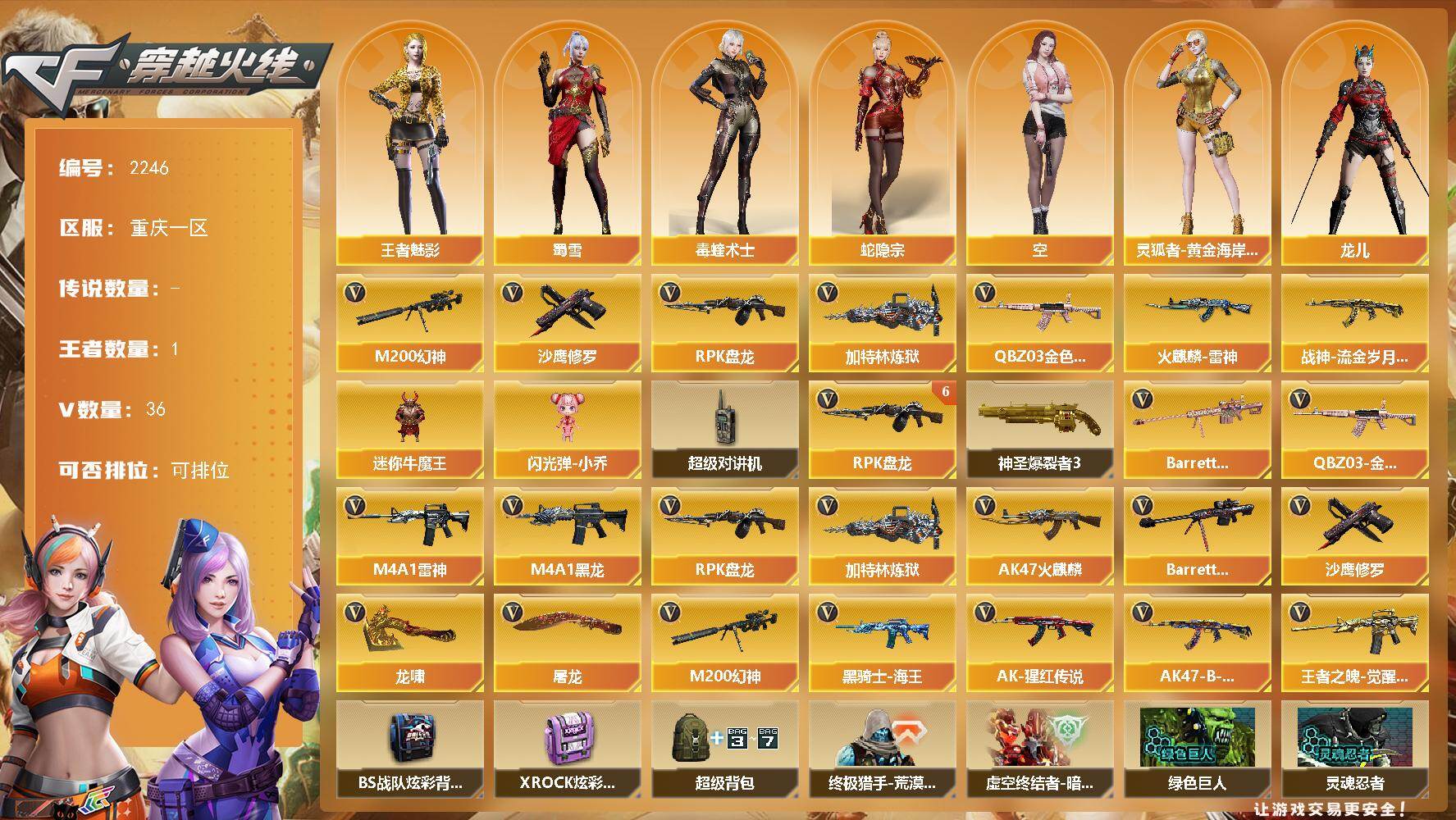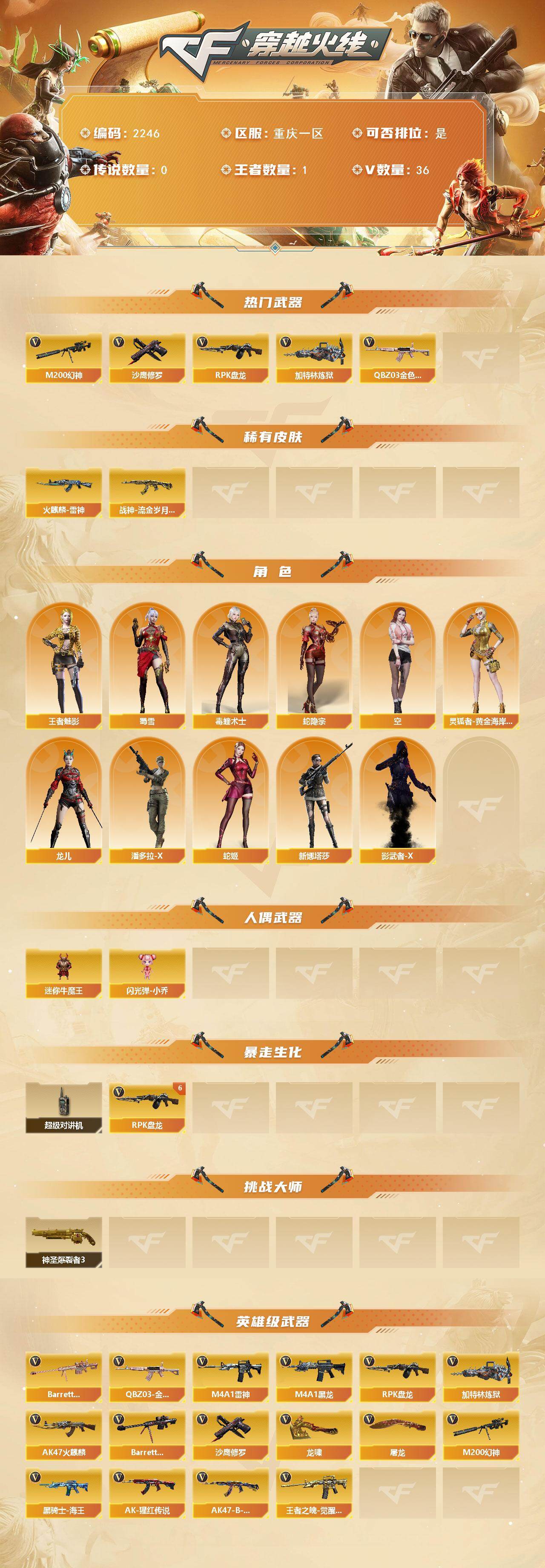 - [16010650]重庆一区-55V-0王者-0炫金 【热门武器】:QBZ03-金色蔷薇,M200-幻神,Kar98K-星神,加特林-炼狱,雷神-小红,COP 357-幻灵*2,沙鹰-修罗*2,荣耀世冠-龙啸 【音效卡】:白虎-盛典舞曲音效卡,炼狱-百战金芒-庆典舞曲音效卡 【皮肤】:M4A1-再燃火线,火麒麟-平天大圣,毁灭-秦师 皮肤,轻型军用手斧-再燃火线 【角色】:影豹,云海玲珑,初恋灵狐,娟娟,兰-新年限定,龙儿,赛斯-X,兔囡囡 【人偶武器】:雷神-小红,Barrett-云海玲珑,迷你裂空之翼,迷你波特博士,夺魂*2,迷你火种,深渊终结者手雷,巴雷特-赏金猎人 【暴走生化】:超级对讲机 【挑战大师】:冰龙粉碎者-白马银枪,激光毁灭者III-白马银枪*2,试炼破坏者III,阐释者III 【英雄级武器】:M4A1-雷神,AN94-超新星,M4A1-幻灵,QBZ03-金色蔷薇,M200-幻神,Kar98K-星神,加特林-炼狱,炼狱-百战金芒,烈龙-云海游龙,沙鹰-修罗*2,COP 357-幻灵*2,麒麟刺,幻灵之锋*3,擎天-云海游龙,荣耀世冠-龙啸,麒麟刺-百战金芒,屠龙-云海游龙,高爆手雷-幻灵*8,手雷-云海游龙,闪光弹-幻灵*9,烟雾弹-幻灵*8 【道具】:CFS限定背包,云海游龙炫彩背包,次元之矛-黄金背包,百战金芒炫彩背包,女皇终结者-魔龙之吻,绿色巨人,灵魂忍者*2,变异宝贝,迷雾幽灵*2,夺命之镰,防化服*3,金色流光-枪王排位,语音特效-盛典烟火,萌萌小葵表情,炽雪表情,云海游龙表情,C4-黑曜,防弹头盔*3,防弹衣*3,C4工具钳*3,手雷包*3 【特殊枪械】:1炼狱