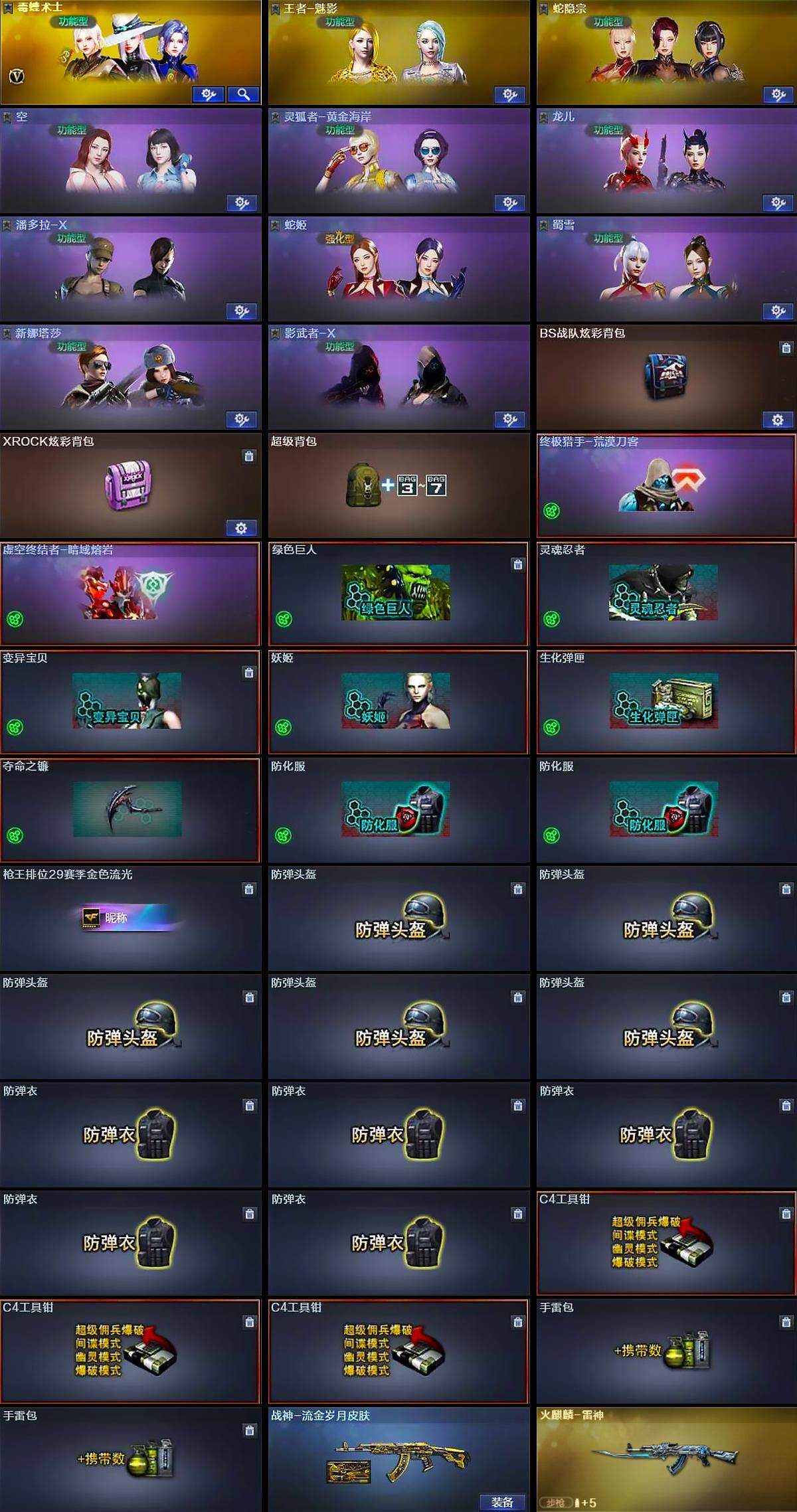 【道具】:BS战队炫彩背包,XROCK炫彩背包,超级背包,终极猎手-荒漠刀客,虚空终结者-暗域熔岩,绿色巨人,灵魂忍者,变异宝贝,妖姬,生化弹匣,夺命之镰,防化服*2,枪王排位29赛季金色流光,防弹头盔*5,防弹衣*5,C4工具钳*3,手雷包*2