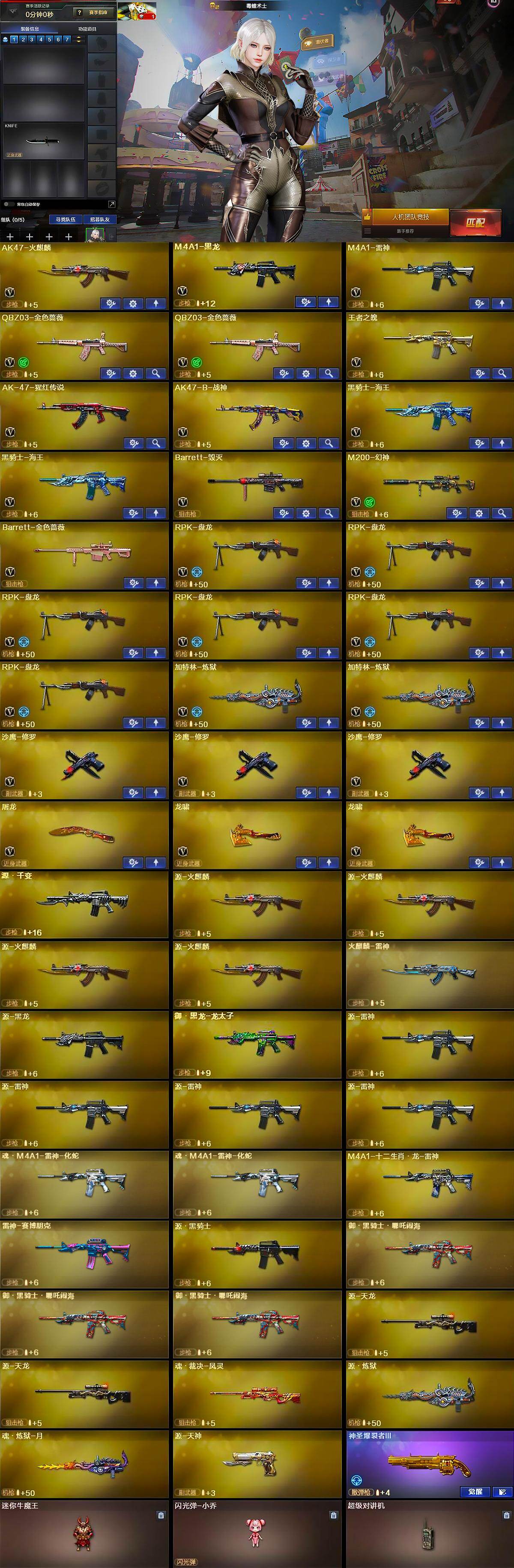 【英雄级武器】:AK47-火麒麟,M4A1-黑龙,M4A1-雷神,QBZ03-金色蔷薇*2,王者之魄-觉醒版,AK-47-猩红传说,AK47-B-战神,黑骑士-海王*2,Barrett-毁灭,M200-幻神,Barrett-金色蔷薇,RPK-盘龙*6,加特林-炼狱*2,沙鹰-修罗*3,屠龙,龙啸*2