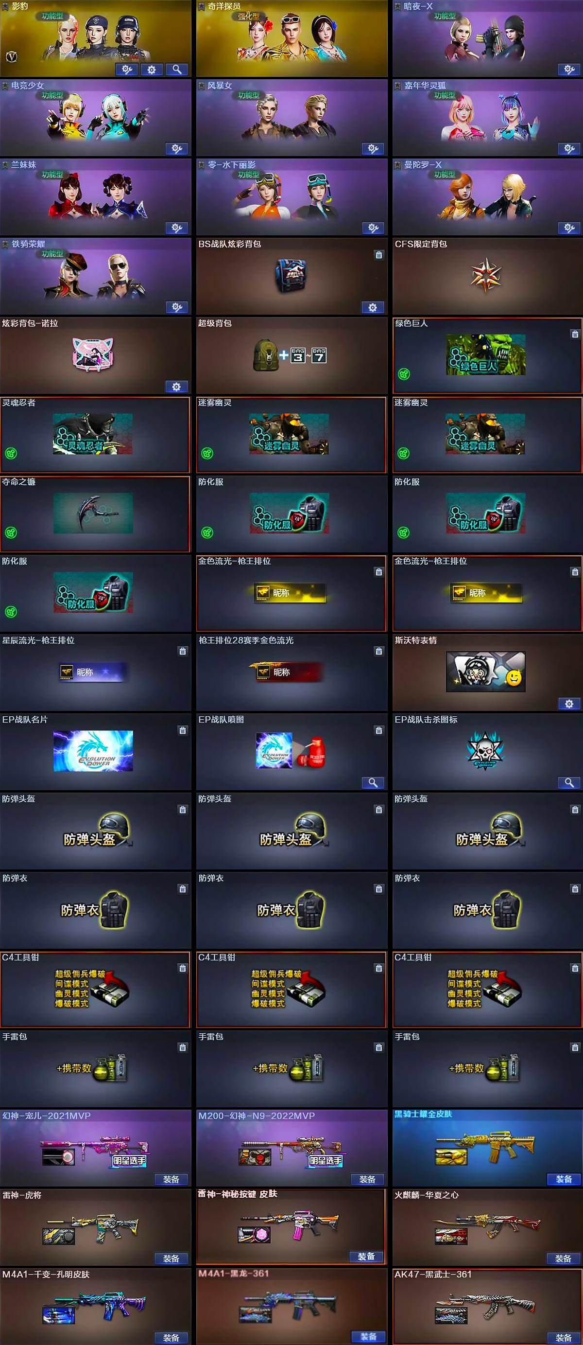 【道具】:BS战队炫彩背包,CFS限定背包,炫彩背包-诺拉,超级背包,哔哩哔哩名片,绿色巨人,灵魂忍者,迷雾幽灵*2,夺命之镰,防化服*3,金色流光-枪王排位*2,星辰流光-枪王排位,枪王排位28赛季金色流光,斯沃特表情,EP战队名片,EP战队喷图,EP战队击杀图标,防弹头盔*3,防弹衣*3,C4工具钳*3,手雷包*3