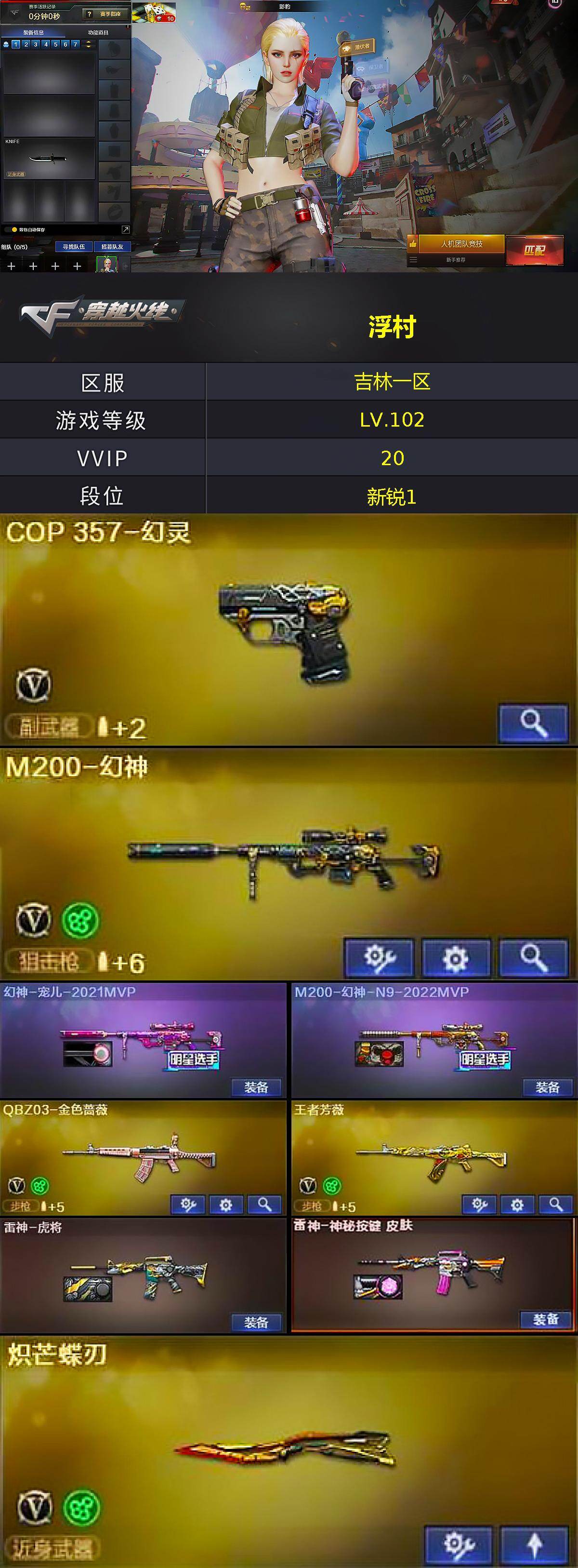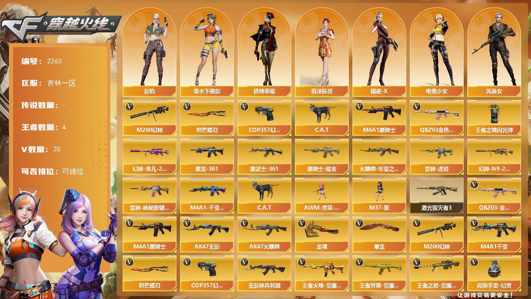 [17104490]吉林一区-23V-4王者武器数-0炫金武器数 【热门武器】:QBZ03-金色蔷薇,M200-幻神,C.A.T,M4A1-黑骑士,COP 357-幻灵,炽芒蝶刃 【王者炫金武器】:王者之魄闪光弹 【皮肤】:幻神-宠儿-2021MVP,M200-幻神-N9-2022MVP,雷神-虎将,雷神-神秘按键 皮肤,火麒麟-华夏之心,M4A1-千变-孔明皮肤,M4A1-黑龙-361,黑骑士耀金皮肤,AK47-黑武士-361 【角色】:影豹,奇洋探员,暗夜-X,电竞少女,风暴女,嘉年华灵狐,兰妹妹,0号玩家,零-水下丽影,曼陀罗-X,铁骑荣耀 【人偶武器】:AWM-灵狐-15周年嘉年华,M37-葵,C.A.T 【挑战大师】:激光毁灭者III 【英雄级武器】:M4A1-千变,AK47-火麒麟,M4A1-黑骑士,AK47-无影,无影-神兵利器,QBZ03-金色蔷薇,王者火魄-觉醒版,王者芳薇-觉醒版,M200-幻神,王者之怒-觉醒版,COP 357-幻灵,屠龙*2,龙啸,炽芒蝶刃,高爆手雷-幻灵*2,闪光弹-幻灵*2,烟雾弹-幻灵*2 【道具】:BS战队炫彩背包,CFS限定背包,炫彩背包-诺拉,超级背包,哔哩哔哩名片,绿色巨人,灵魂忍者,迷雾幽灵*2,夺命之镰,防化服*3,金色流光-枪王排位*2,星辰流光-枪王排位,枪王排位28赛季金色流光,斯沃特表情,EP战队名片,EP战队喷图,EP战队击杀图标,防弹头盔*3,防弹衣*3,C4工具钳*3,手雷包*3 【特殊枪械】:1黑骑士