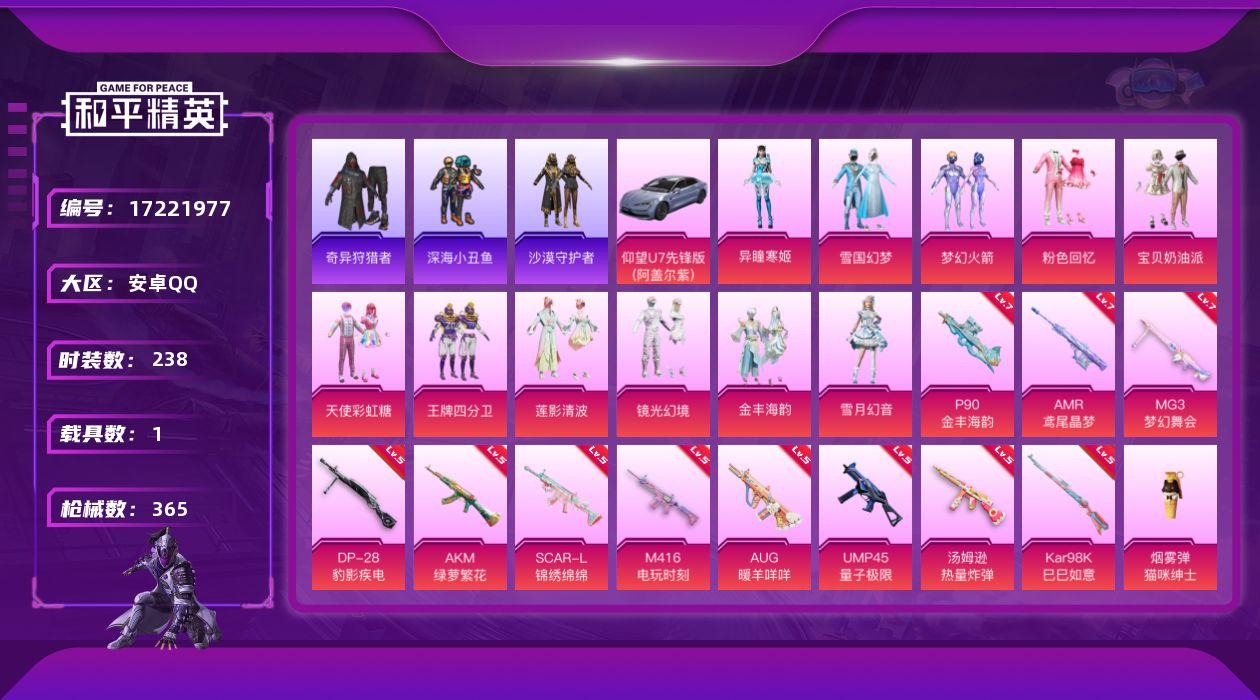 安卓 手Q-11粉装-16特效枪-1载具-3粉色飞行器-115266热力值-24王牌印记-238套装-365枪皮