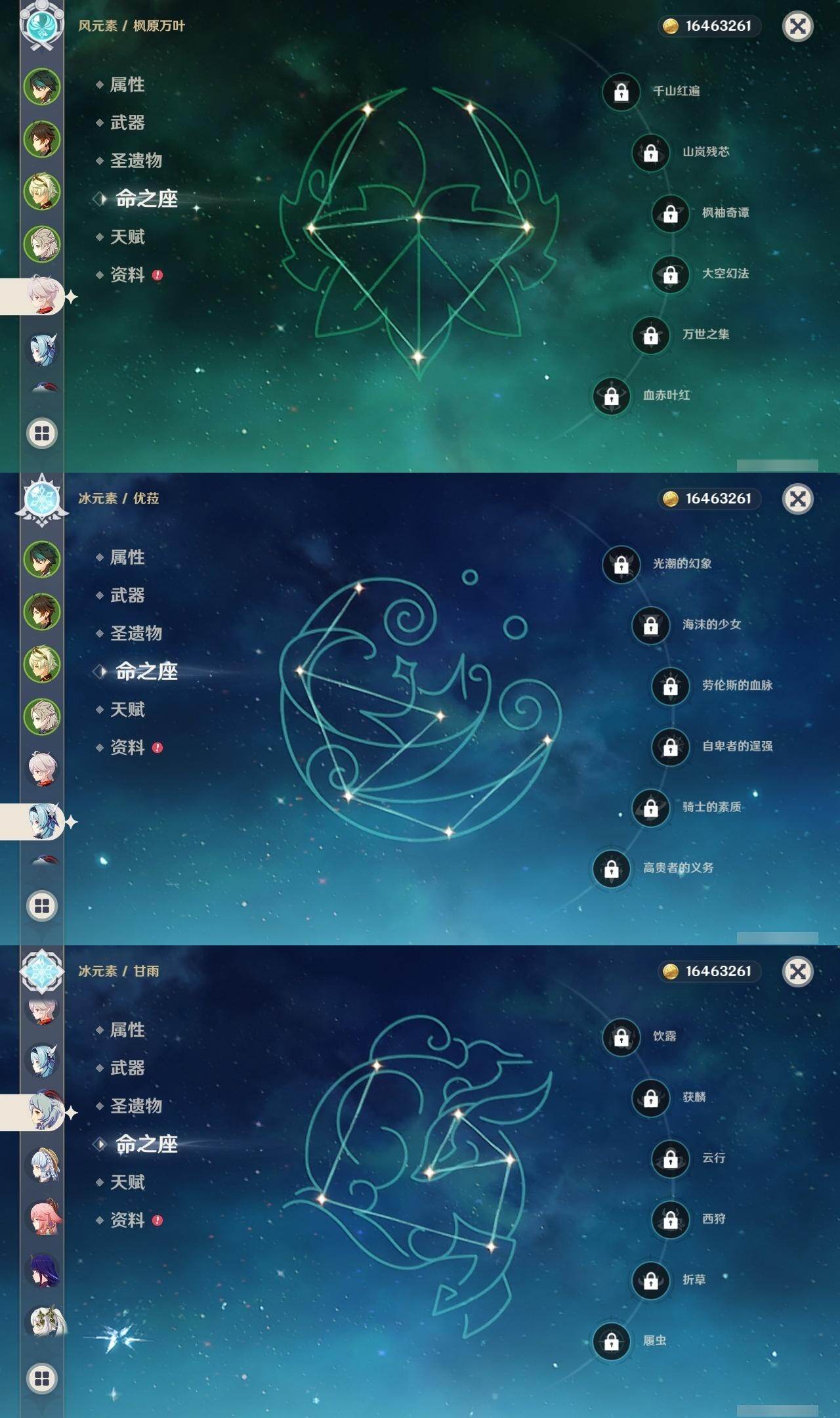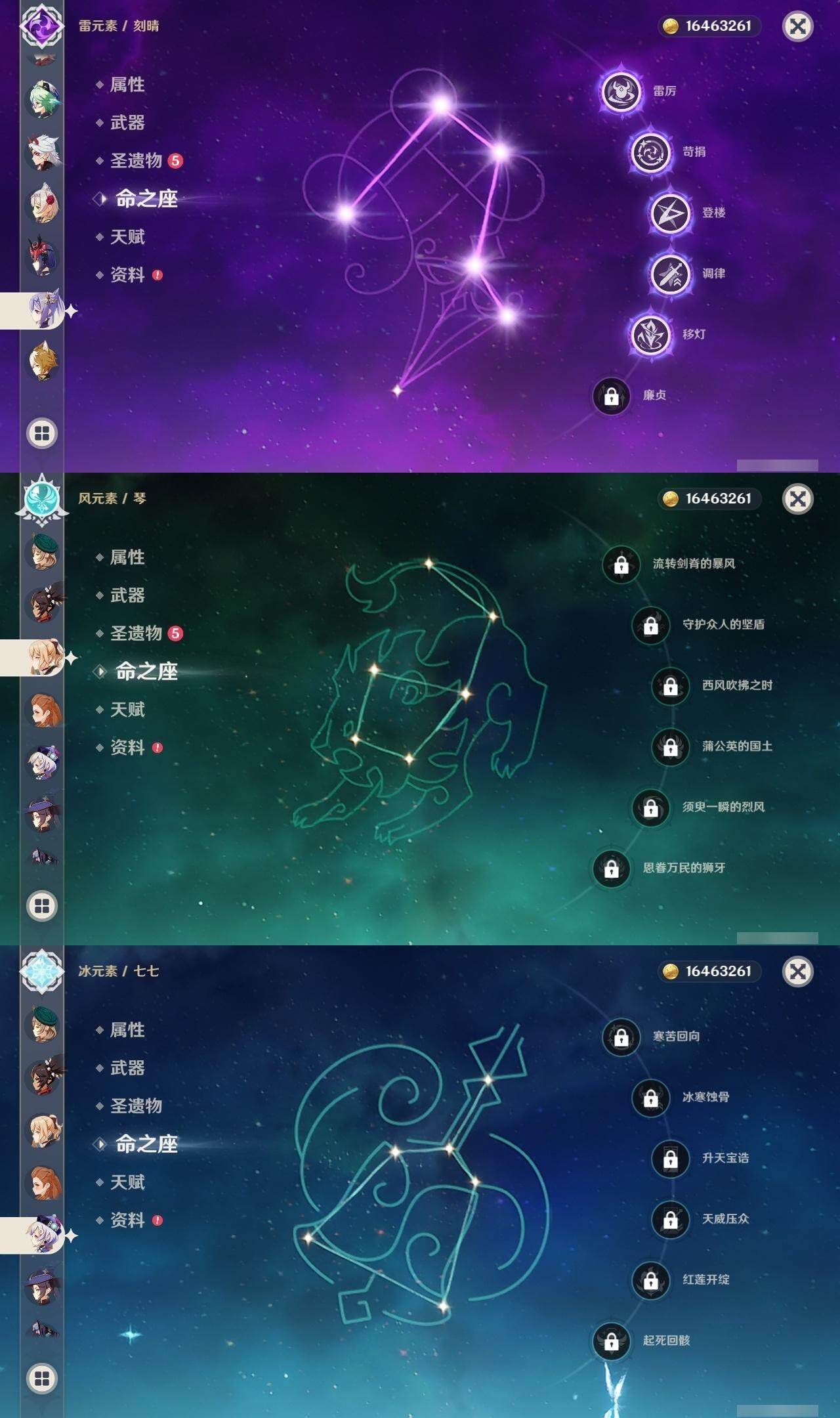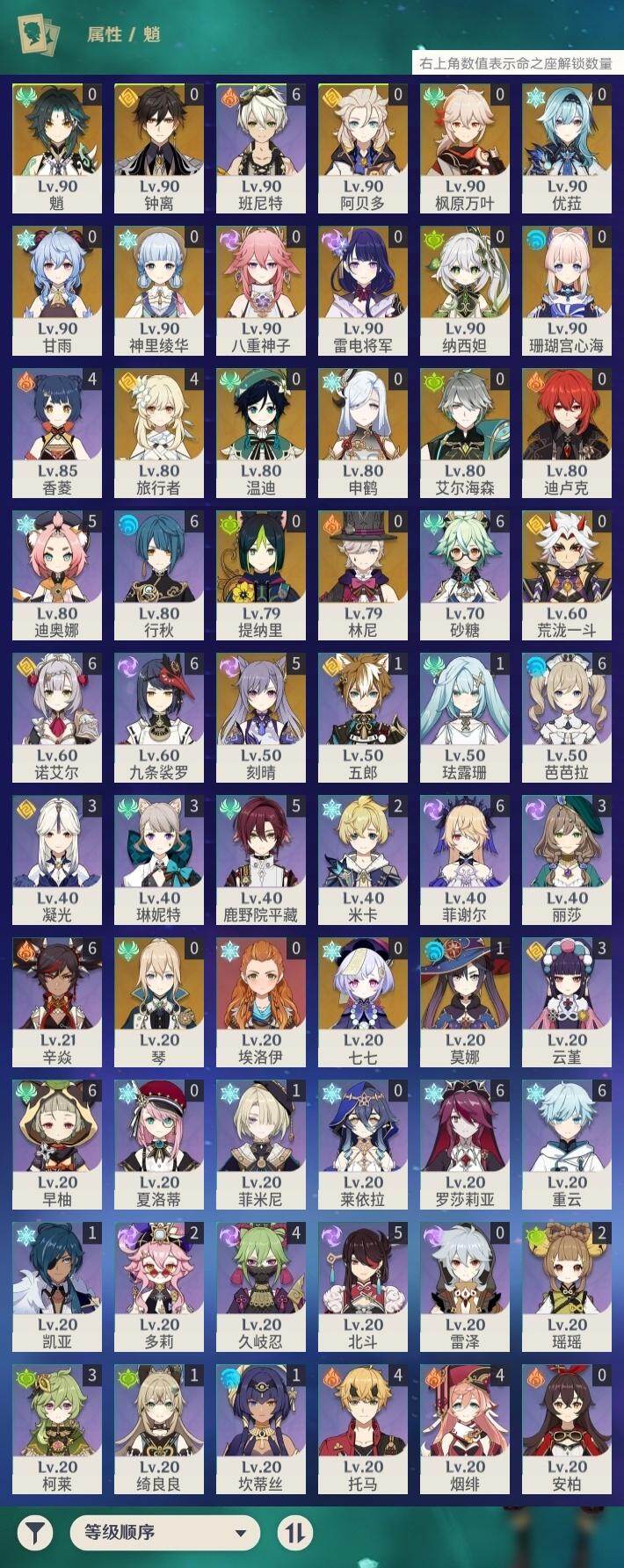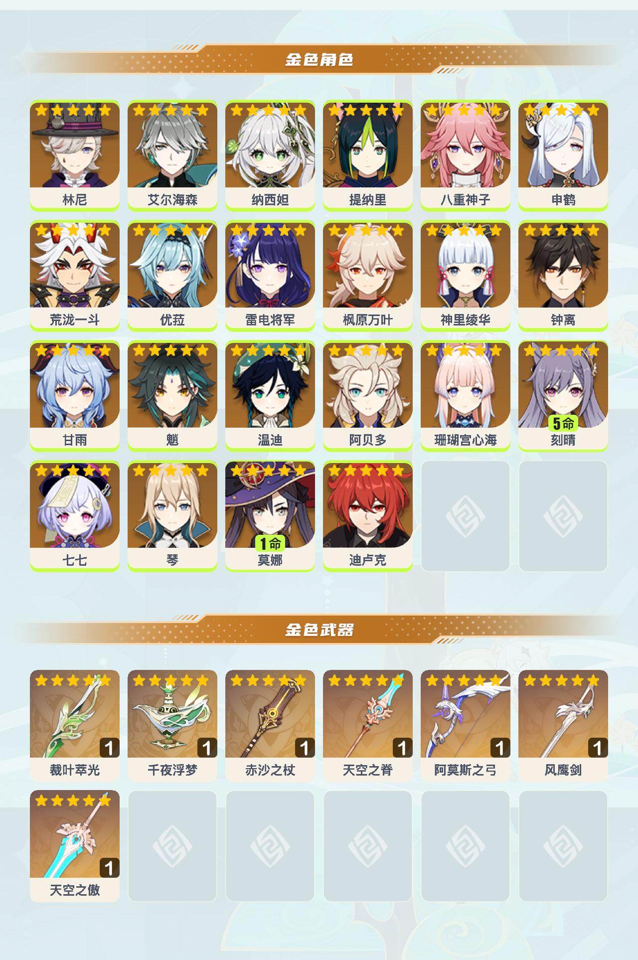 0命林尼,0命艾尔海森,0命纳西妲,0命提纳里,0命八重神子,0命申鹤,0命荒泷一斗,0命优菈,0命雷电将军,0命枫原万叶,0命神里绫华,0命钟离,0命甘雨,0命魈,0命温迪,0命阿贝多,0命珊瑚宫心海,5命刻晴,0命七七,0命琴,1命莫娜,0命迪卢克,精1裁叶萃光,精1千夜浮梦,精1赤沙之杖,精1天空之脊,精1阿莫斯之弓,精1风鹰剑,精1天空之傲