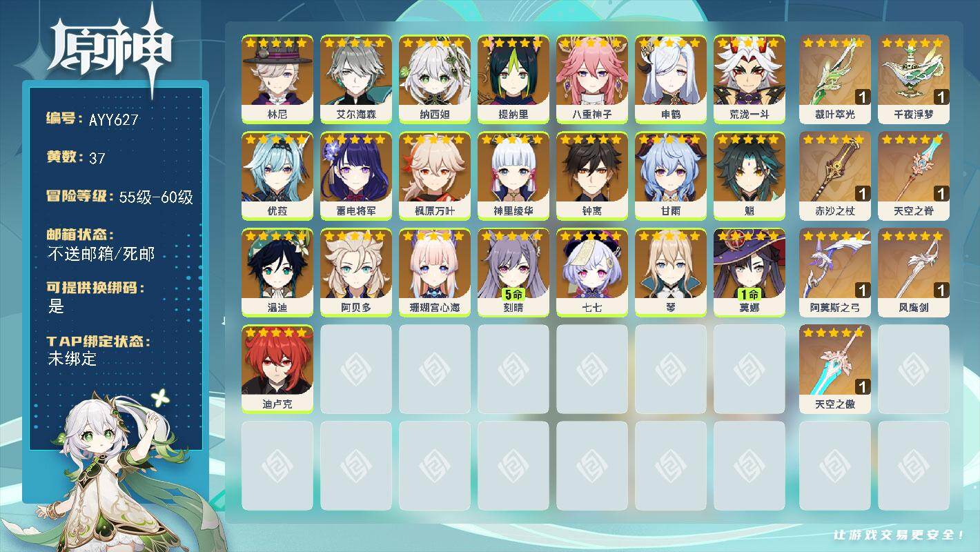 [17222189]【店主推荐捡漏号】59级/37黄/女主/22个五星角色/9个五星武器 0命林尼,0命艾尔海森,0命纳西妲,0命提纳里,0命八重神子,0命申鹤,0命荒泷一斗,0命优菈,0命雷电将军,0命枫原万叶,0命神里绫华,0命钟离,0命甘雨,0命魈,0命温迪,0命阿贝多,0命珊瑚宫心海,5命刻晴,0命七七,0命琴,1命莫娜,0命迪卢克,精1裁叶萃光,精1千夜浮梦,精1赤沙之杖,精1天空之脊,精1阿莫斯之弓,精1风鹰剑,精1天空之傲