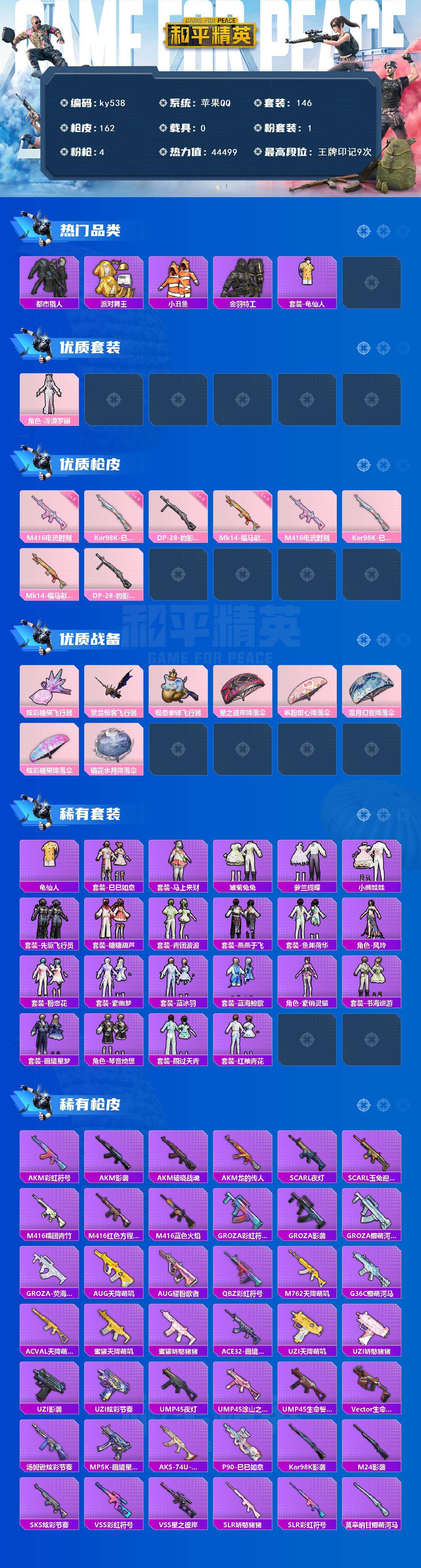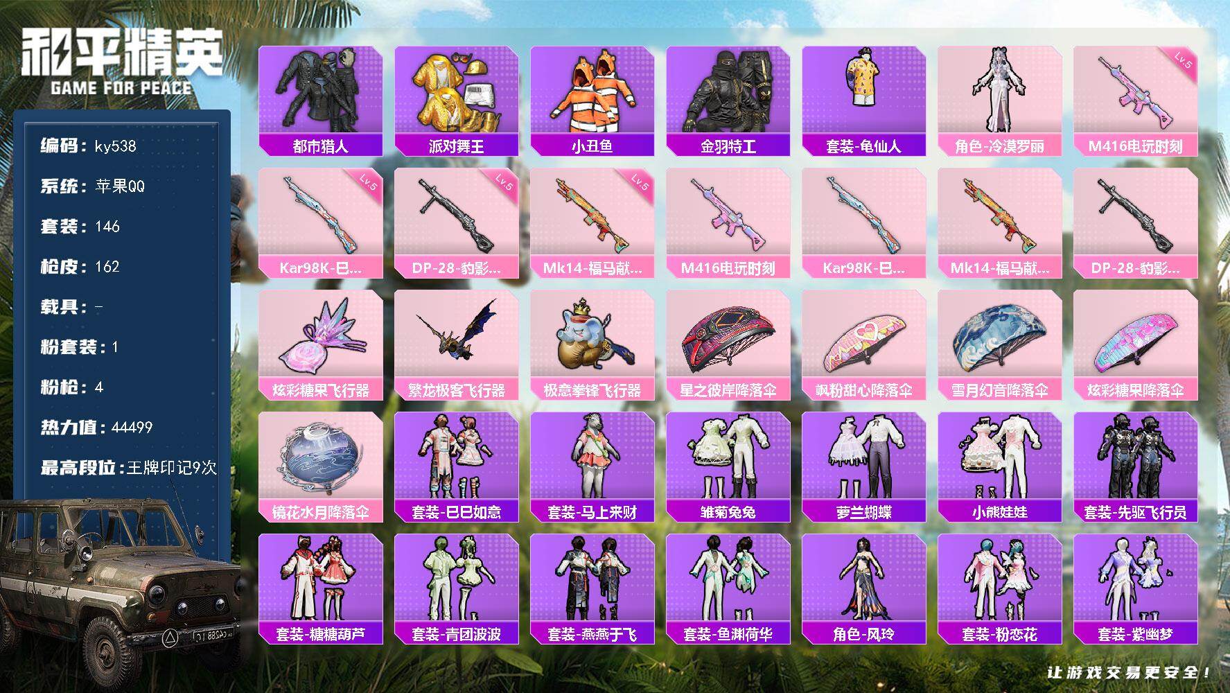[17222836]苹果 手Q-1粉装-4特效枪-0载具-3粉色飞行器-44499热力值-9王牌印记-146套装-162枪皮 【热门品类】:套装-都市猎人,套装-派对舞王,套装-小丑鱼,套装-金羽特工,套装-龟仙人 【粉色套装】:角色-冷漠罗丽 【粉色枪皮等级】:M416-电玩时刻(五级),Kar98K-巳巳如意(五级),Mk14-福马献瑞(五级),DP-28-豹影疾电(五级) 【粉色枪皮】:M416-电玩时刻,Kar98K-巳巳如意,Mk14-福马献瑞,DP-28-豹影疾电 【粉色飞行器】:炫彩糖果飞行器,繁龙极客飞行器,极意拳锋飞行器 【粉色降落伞】:星之彼岸降落伞,飒粉甜心降落伞,雪月幻音降落伞,炫彩糖果降落伞,镜花水月降落伞 【稀有套装】:套装-龟仙人,套装-巳巳如意,套装-雪国风尚,套装-炫彩糖果,套装-马上来财,套装-雏菊兔兔,套装-萝兰蝴蝶,套装-小熊娃娃,套装-先驱飞行员,套装-糖糖葫芦,套装-青团波波,套装-燕燕于飞,套装-鱼渊荷华,角色-风玲,套装-粉恋花,套装-紫幽梦,套装-蓝冰羽,套装-蓝海鲸歌,角色-紫俏灵猫,套装-书海巡游,套装-画境星梦,套装-琴音绮想,套装-雨过天青,套装-红釉青花 【稀有枪皮】:AUG-冰晶雪宝,AKM-彩虹符号,AKM-影袭,AKM-破晓战魂,AKM-龙的传人,SCAR-L-夜灯,SCAR-L-玉兔迎春,M416-糯团青竹,M416-红色方程式,M416-蓝色火焰,GROZA-彩虹符号,GROZA-影袭,GROZA-懵萌河马,GROZA-荧海星豚,AUG-天降萌叽,AUG-耀粉歌者,QBZ-彩虹符号,M762-天降萌叽,G36C-懵萌河马,AC-VAL-天降萌叽,蜜獾-天降萌叽,蜜獾-娇憨猪猪,ACE32-画境星梦,UZI-天降萌叽,UZI-娇憨猪猪,UZI-影袭,UZI-炫彩节奏,UMP45-夜灯,UMP45-涂山之恋,UMP45-生命誓言,Vector-生命誓言,汤姆逊-炫彩节奏,MP5K-画境星梦,AKS-74U-鬼刀,P90-巳巳如意,Kar98K-影袭,M24-影袭,SKS-炫彩节奏,VSS-彩虹符号,VSS-星之彼岸,SLR-娇憨猪猪,SLR-彩虹符号,莫辛纳甘-懵萌河马,M1加兰德-画境星梦,S686-生命誓言,S686-巳巳如意,S1897-炫彩节奏,S12K-夜灯,S12K-娇憨猪猪,S12K-幻影战神,DBS-彩