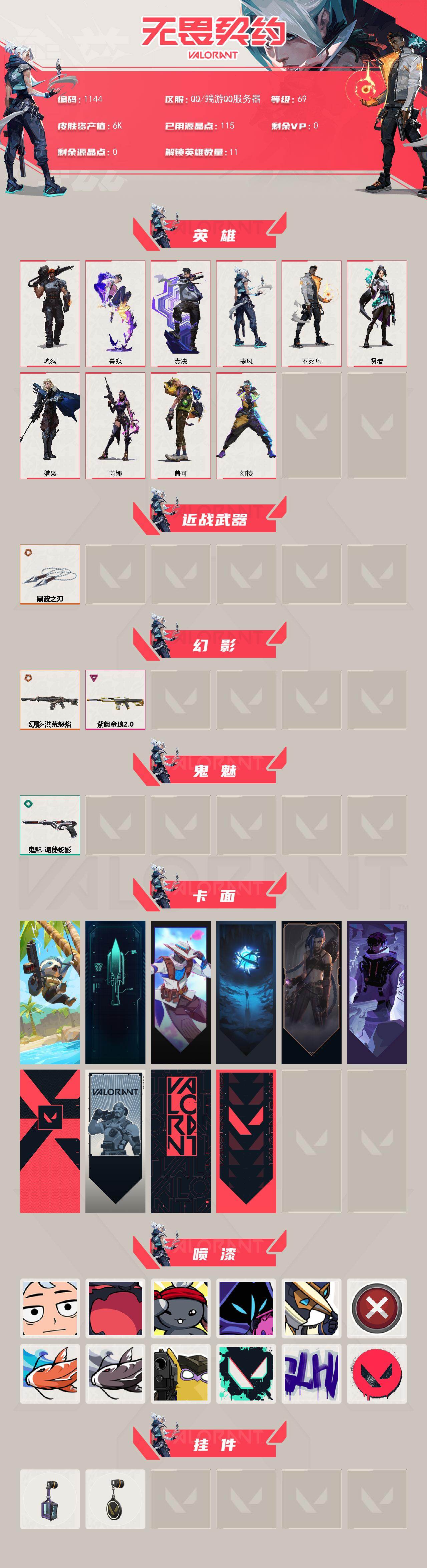 [17223372]【英雄】:幻棱,炼狱,暮蝶,壹决,捷风,不死鸟,贤者,猎枭,芮娜,盖可 【近战武器】:近战武器-黑波之刃 【幻影】:幻影-洪荒怒焰,幻影-紫阙金琅//2.0 【鬼魅】:鬼魅-诡秘蛇影 【卡面】:树懒大作战 卡面,零点嗅探设计图 卡面,无畏契约GO!第一卷:零 卡面,无垠星环 卡面,《双城之战》金克丝 卡面,逆向独行 卡面 ,代号红色 卡面,新兵报到 卡面,V契约 卡面,无畏契约 卡面 【喷漆】:又被闪了 喷漆,黯兽卖萌 喷漆,梦幻小队 喷漆,情绪控制 喷漆,哨卫滑步 喷漆,买装还是存钱 喷漆,红鳞 喷漆,松叶 喷漆,放下武器 喷漆,胜利属于无畏契约 喷漆,GLHF 喷漆,无畏契约 喷漆 【挂饰】:动力机箱 挂饰,无畏契约 纪念币 挂饰