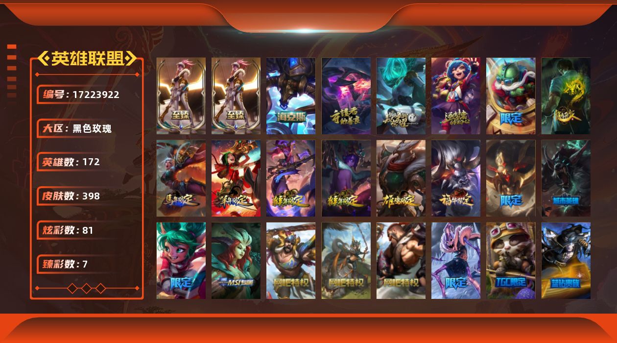 [17223922]可二次【特价出售/店主推荐】黄金段位-172英雄-398皮肤-81炫彩-0终极-7神话-87限定-38传说-91史诗