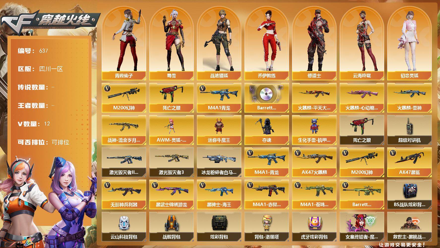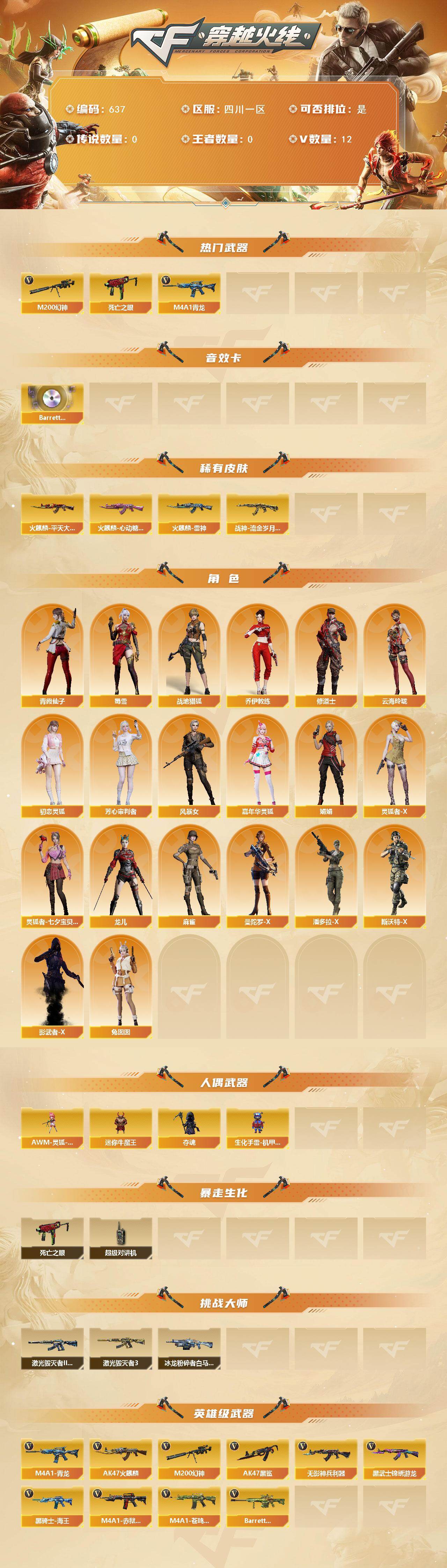 [17224769]四川一区-12V-0王者-0炫金 【热门武器】:M4A1-青龙,M200-幻神,死亡之眼 【音效卡】:Barrett-碧霄极光音效卡 【皮肤】:火麒麟-雷神*2,火麒麟-平天大圣,火麒麟-心动糖果,战神-流金岁月皮肤 【角色】:战地猎狐,乔伊教练,修道士,云海玲珑,初恋灵狐,芳心审判者,风暴女,嘉年华灵狐,娟娟,灵狐者-X,灵狐者-七夕宝贝,龙儿,麻雀,曼陀罗-X,潘多拉-X,青霞仙子,斯沃特-X,蜀雪,兔囡囡,影武者-X 【人偶武器】:AWM-灵狐-15周年嘉年华,迷你牛魔王,夺魂,生化手雷-机甲核心*2 【暴走生化】:死亡之眼,超级对讲机 【挑战大师】:冰龙粉碎者-白马银枪*2,激光毁灭者III-白马银枪,激光毁灭者III 【英雄级武器】:AK47-火麒麟,AK47-黑鲨,M4A1-青龙,无影-神兵利器,黑武士-锦绣游龙,黑骑士-海王,M200-幻神,M4A1-赤狱骑士,M4A1-苍鸣雷神,Barrett-碧霄极光 【道具】:BS战队炫彩背包,云山科技背包,战舰背包,炫彩背包,背包-洛丽塔,虎牙炫彩背包,女皇终结者-魔龙之吻,救世主-黑桃战神,妩媚妖姬,绿色巨人,灵魂忍者,变异宝贝,迷雾幽灵,夺命之镰,防化服*3,金色流光-枪王排位*2,星辰流光-枪王排位,流光-鎏金之域,枪王排位28赛季金色流光,炽雪表情,动感闪耀表情,EP战队名片,防弹头盔*5,防弹衣*5,C4工具钳*6,手雷包*5 【特殊枪械】: