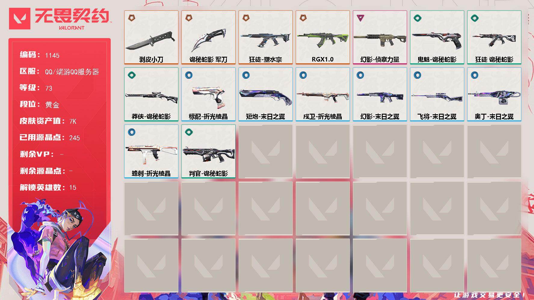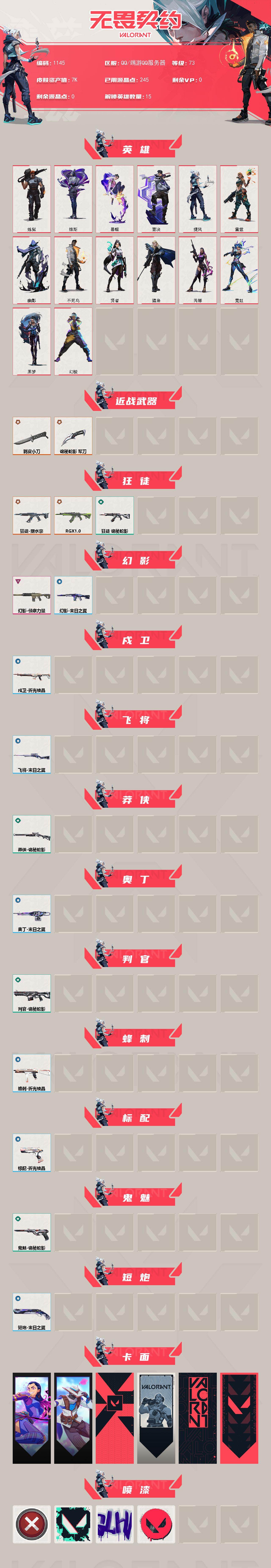 [17224970]【英雄】:幻棱,炼狱,维斯,暮蝶,壹决,捷风,雷兹,幽影,不死鸟,贤者,猎枭,芮娜,霓虹,黑梦 【近战武器】:近战武器-剥皮小刀,近战武器-诡秘蛇影 军刀 【狂徒】:狂徒-塑水宗,狂徒-RGX 11z Pro,狂徒-诡秘蛇影 【幻影】:幻影-侦察力量,幻影-末日之翼 【戍卫】:戍卫-折光棱晶 【飞将】:飞将-末日之翼 【莽侠】:莽侠-诡秘蛇影 【奥丁】:奥丁-末日之翼 【判官】:判官-诡秘蛇影 【蜂刺】:蜂刺-折光棱晶 【标配】:标配-折光棱晶 【鬼魅】:鬼魅-诡秘蛇影 【短炮】:短炮-末日之翼 【卡面】:无畏契约GO!第一卷:芮娜 卡面,无畏契约GO!第一卷:零 卡面,代号红色 卡面,新兵报到 卡面,V契约 卡面,无畏契约 卡面 【喷漆】:买装还是存钱 喷漆,胜利属于无畏契约 喷漆,GLHF 喷漆,无畏契约 喷漆 【挂饰】:无畏契约 纪念币 挂饰