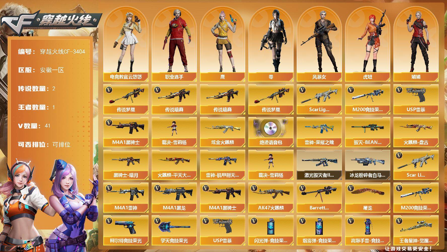 [17225299]安徽一区-41V-1王者-1炫金 【传说武器】:传说暗裔,传说梦魇 【热门武器】:传说暗裔,传说梦魇,Scar Light-白虎*3,M200-竞技荣光,M4A1-黑骑士,裁决-雪莉杨,USP-雷暴 【王者炫金武器】:炫金火麒麟 【音效卡】:绝迹语音包 【皮肤】:雷神-荣耀之魄,雷神-机甲刑天皮肤,火麒麟-平天大圣,火麒麟-盘古,毁灭-BEAN-2020MVP,黑骑士-暗月*2 【角色】:零,电竞教官-云悠悠,鹰,风暴女,虎妞,娟娟,樱-战斗天使,职业选手 【人偶武器】:裁决-雪莉杨 【挑战大师】:冰龙粉碎者-白马银枪*2,激光毁灭者III-白马银枪*2 【英雄级武器】:AK47-火麒麟,M4A1-黑龙,M4A1-雷神,M4A1-黑骑士,Scar Light-白虎*3,Barrett-毁灭,M200-竞技荣光,王者星神-觉醒版,USP-雷暴,柯尔特-竞技荣光*3,屠龙,擎天-竞技荣光*3,高爆手雷-竞技荣光*7,闪光弹-竞技荣光*7,烟雾弹-竞技荣光*7 【道具】:亚洲杯纪念炫彩背包,炫彩背包,超级背包,绿色巨人,灵魂忍者,迷雾幽灵,夺命之镰,防化服*2,枪王排位29赛季金色流光,EP战队名片,防弹头盔*4,防弹衣*4,C4工具钳*4,手雷包*4 【特殊枪械】:3白虎,1黑骑士