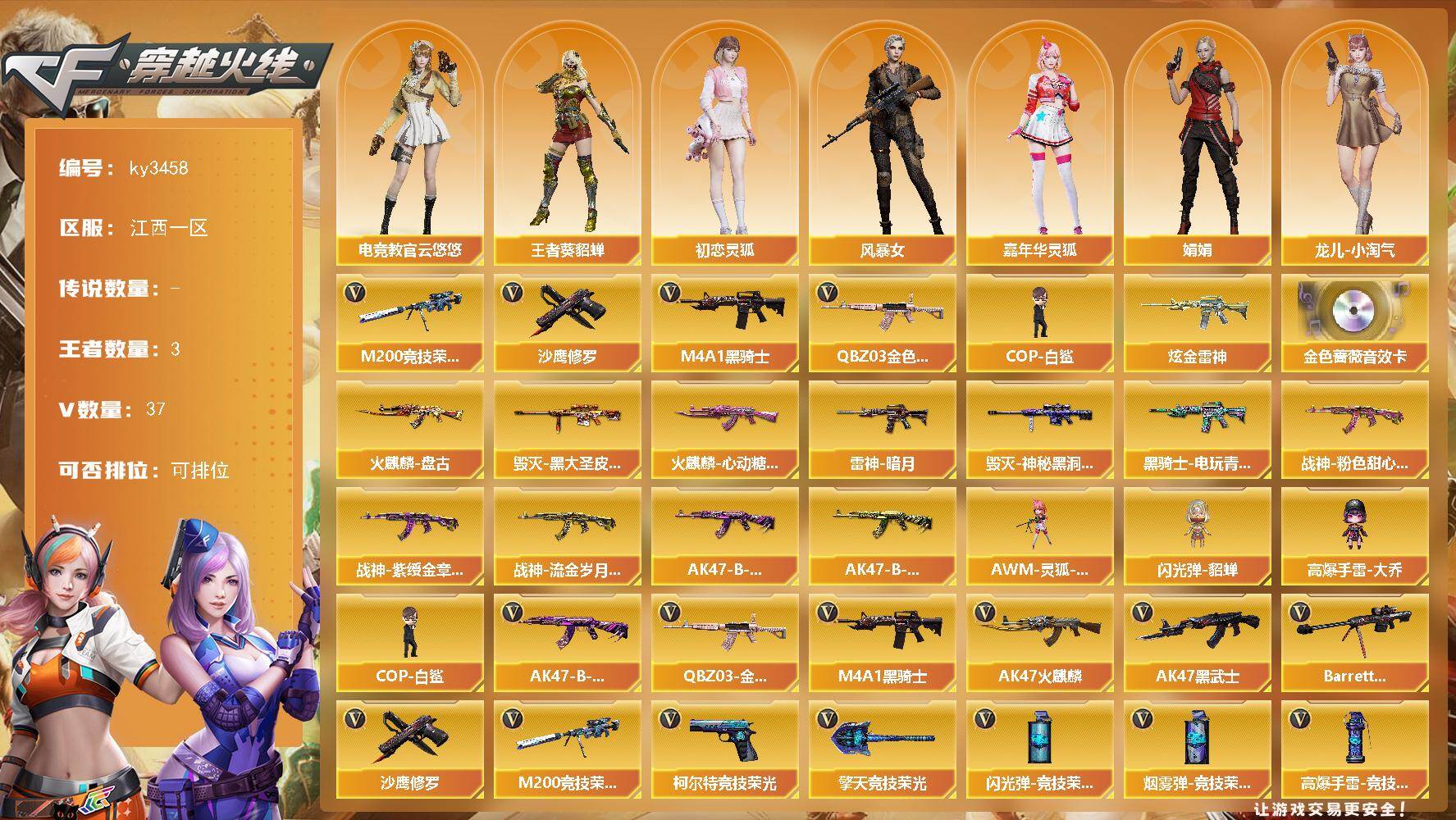 [17225359]江西一区-37V-3王者-1炫金 【热门武器】:QBZ03-金色蔷薇,M200-竞技荣光,M4A1-黑骑士,COP-白鲨,沙鹰-修罗 【王者炫金武器】:炫金雷神 【音效卡】:QBZ03-金色蔷薇音效卡 【皮肤】:雷神-暗月,火麒麟-盘古,火麒麟-心动糖果,毁灭-黑大圣皮肤,毁灭-神秘黑洞皮肤,黑骑士-电玩青兔皮肤,战神-粉色甜心皮肤*2,战神-紫绶金章皮肤*3,战神-流金岁月皮肤,AK47-B-常胜将军-曹操,AK47-B-常胜将军-孙权*3 【角色】:电竞教官-云悠悠,王者-葵-貂蝉,初恋灵狐,风暴女,嘉年华灵狐,娟娟,龙儿-小淘气,潘多拉-甜心教官,斯沃特-X 【人偶武器】:COP-白鲨,AWM-灵狐-15周年嘉年华,闪光弹-貂蝉,高爆手雷-大乔 【英雄级武器】:AK47-火麒麟*2,M4A1-黑骑士,AK47-黑武士,QBZ03-金色蔷薇,AK-47-猩红传说,王者火魄-觉醒版,AK47-B-常胜将军,Barrett-毁灭,M200-竞技荣光,沙鹰-修罗,柯尔特-竞技荣光*5,擎天-竞技荣光*2,王者之击-觉醒版,高爆手雷-竞技荣光*6,闪光弹-竞技荣光*3,烟雾弹-竞技荣光*5 【道具】:云山科技背包,超级背包,女皇终结者-魔龙之吻,绿色巨人,灵魂忍者,迷雾幽灵,夺命之镰,防化服*3,金色流光-枪王排位*2,星辰流光-枪王排位,防弹头盔*3,防弹衣*3,C4工具钳*3,手雷包*3 【特殊枪械】:1黑骑士