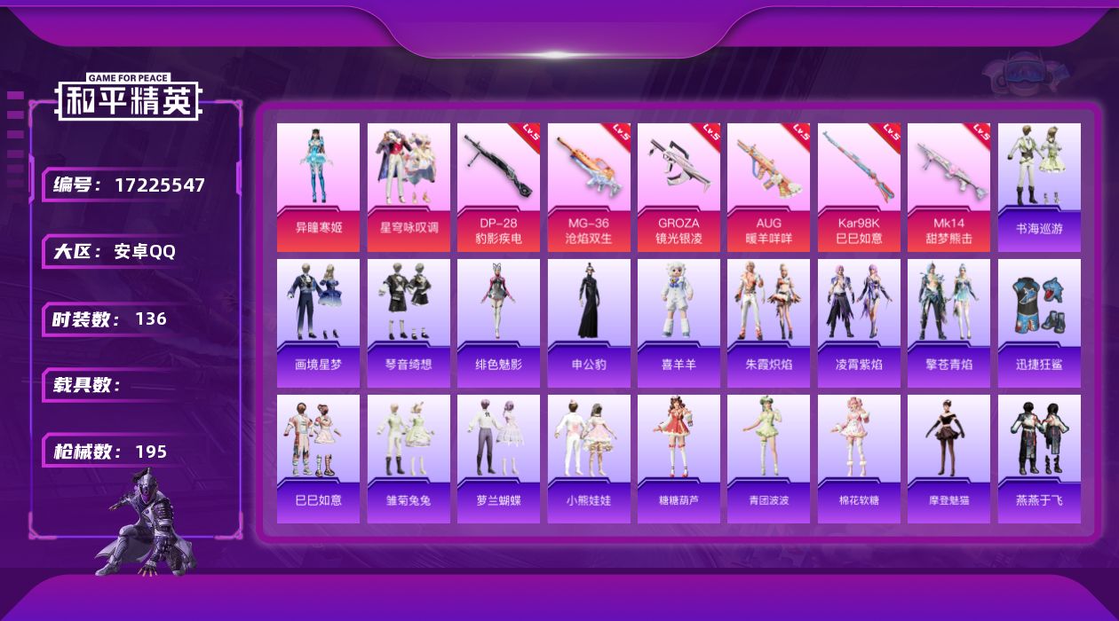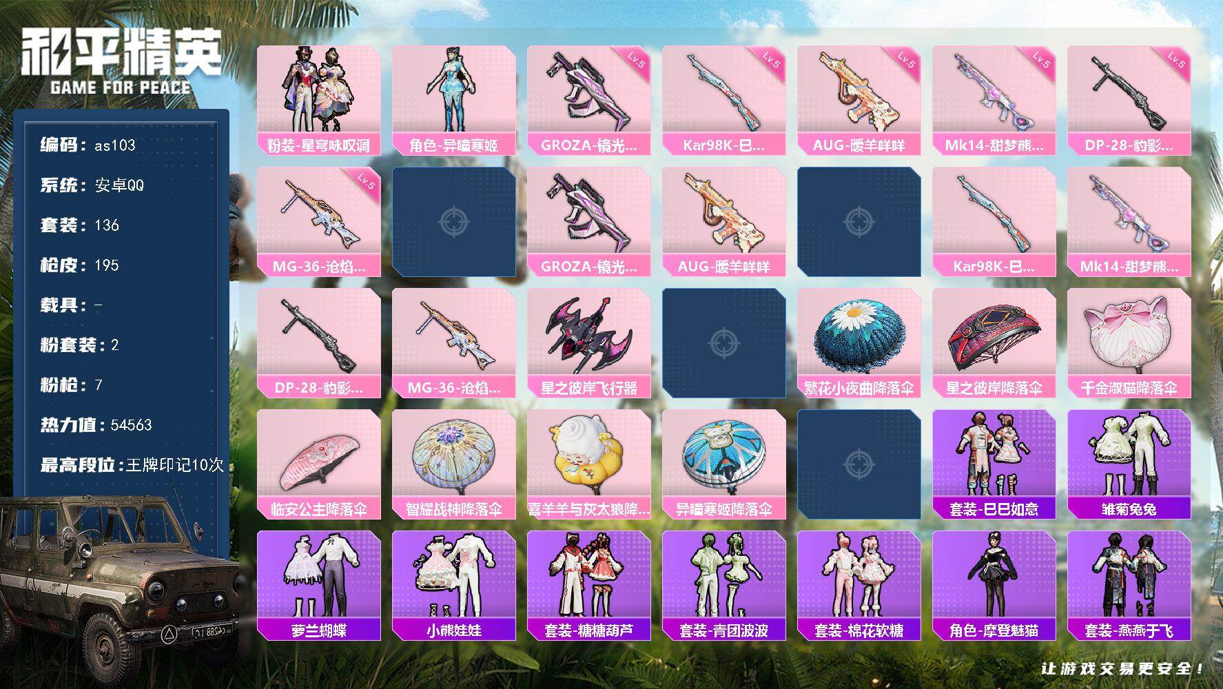 [17225547]安卓 手Q-2粉装-7特效枪-0载具-2粉色飞行器-54563热力值-10王牌印记-136套装-195枪皮 【粉色套装】:粉装-星穹咏叹调,角色-异瞳寒姬 【粉色枪皮等级】:GROZA-镜光银凌(五级),AUG-暖羊咩咩(五级),AKS-74U-森灵之息(五级),Kar98K-巳巳如意(五级),Mk14-甜梦熊击(五级),DP-28-豹影疾电(五级),MG-36-沧焰双生(五级) 【粉色枪皮】:GROZA-镜光银凌,AUG-暖羊咩咩,AKS-74U-森灵之息,Kar98K-巳巳如意,Mk14-甜梦熊击,DP-28-豹影疾电,MG-36-沧焰双生 【粉色飞行器】:星之彼岸飞行器 【粉色降落伞】:绝对恒星降落伞,繁花小夜曲降落伞,星之彼岸降落伞,千金淑猫降落伞,临安公主降落伞,智耀战神降落伞,喜羊羊与灰太狼降落伞,异瞳寒姬降落伞,炫彩糖果降落伞 【稀有套装】:套装-巳巳如意,套装-炫彩糖果,套装-雏菊兔兔,套装-萝兰蝴蝶,套装-小熊娃娃,套装-糖糖葫芦,套装-青团波波,套装-棉花软糖,角色-摩登魅猫,套装-燕燕于飞,套装-鱼渊荷华,角色-蜜桃派对,套装-紫幽梦,套装-蓝冰羽,套装-星影赞美诗,套装-星渊小夜曲,角色-时希公主,套装-朱霞炽焰,套装-凌霄紫焰,套装-擎苍青焰,玩偶服-喜羊羊,角色-申公豹,角色-绯色魅影,套装-书海巡游,套装-画境星梦,套装-琴音绮想 【稀有枪皮】:AKM-破晓战魂,AKM-虎虎生威,AKM-龙的传人,M16A4-幻世战舞者,M16A4-生命誓言,M16A4-千金淑猫,SCAR-L-玉兔迎春,SCAR-L-红色方程式,M416-糯团青竹,M416-红色方程式,M416-蓝色火焰,GROZA-懵萌河马,AUG-2P战斗服款,AUG-天降萌叽,AUG-耀粉歌者,QBZ-未来歌姬,M762-天降萌叽,M762-彩虹符号,G36C-懵萌河马,G36C-星穹咏叹调,AC-VAL-天降萌叽,蜜獾-天降萌叽,ACE32-画境星梦,ARX-凌霄紫焰,UZI-啾咪啾咪,UZI-炫彩节奏,UZI-红色方程式,UZI-月影灵韵,UMP45-夜灯,UMP45-生命誓言,UMP45-蓝色火焰,Vector-彩虹符号,汤姆逊-天降萌叽,汤姆逊-炫彩节奏,汤姆逊-环太平洋,汤姆逊-耀粉歌者,MP5K-画境星梦,JS9-凌霄紫焰,P90-巳巳如意,Kar98K-彩虹符号