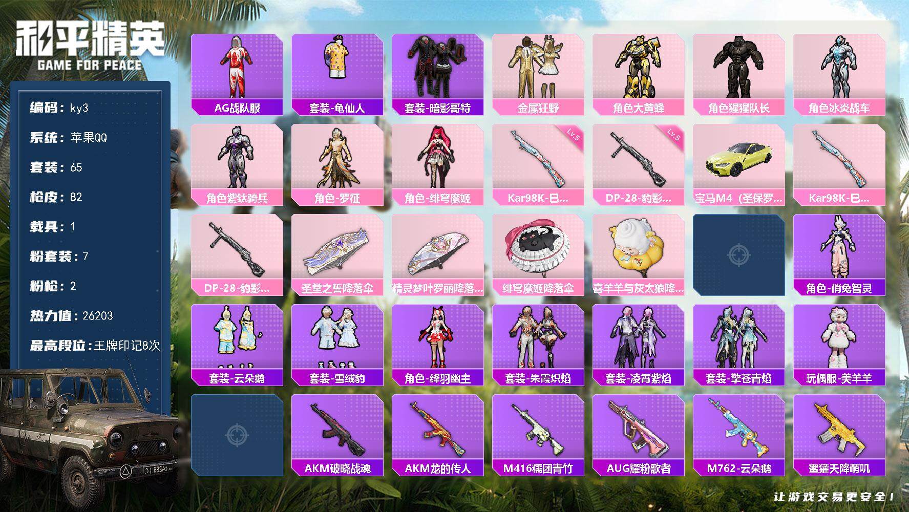 [17226022]苹果 手Q-7粉装-2特效枪-1载具-1粉色飞行器-26203热力值-8王牌印记-65套装-82枪皮 【热门品类】:套装-AG战队服,套装-龟仙人,套装-暗影哥特 【粉色套装】:粉装-金属狂野,角色-大黄蜂,角色-猩猩队长,角色-冰炎战车,角色-紫钛骑兵,角色-罗征,角色-绯穹魔姬 【粉色枪皮等级】:Kar98K-巳巳如意(五级),DP-28-豹影疾电(五级) 【粉色载具】:宝马M4(圣保罗黄) 【粉色枪皮】:Kar98K-巳巳如意,DP-28-豹影疾电 【粉色降落伞】:圣堂之誓降落伞,精灵梦叶罗丽降落伞,绯穹魔姬降落伞,喜羊羊与灰太狼降落伞,炫彩糖果降落伞 【稀有套装】:套装-龟仙人,套装-炫彩糖果,角色-俏兔智灵,套装-云朵鹅,套装-雪绒豹,角色-绛羽幽主,套装-朱霞炽焰,套装-凌霄紫焰,套装-擎苍青焰,玩偶服-美羊羊,角色-霜刃之御 【稀有枪皮】:AUG-冰晶雪宝,AKM-破晓战魂,AKM-龙的传人,M416-糯团青竹,AUG-耀粉歌者,M762-云朵鹅,蜜獾-天降萌叽,蜜獾-折梦之诗,ARX-凌霄紫焰,UZI-啾咪啾咪,UZI-天降萌叽,UZI-影袭,UMP45-生命誓言,Vector-炎氏战神,Vector-生命誓言,汤姆逊-天降萌叽,JS9-凌霄紫焰,AWM-激战未来,SKS-折梦之诗,Mini14-熔岩统帅,Mini14-绯穹魔姬,M417-惊鸿侠骨,M200-惊鸿侠骨,SVD-云朵鹅,S1897-荧海星豚,DBS-圣堂之誓,DBS-荧海星豚,SPAS-12-云朵鹅,M249-彩虹符号,M249-星之彼岸,M249-绯穹魔姬,MG3-幻世战舞者,MG3-惊鸿侠骨,MG-36-凌霄紫焰,P92-凌霄紫焰,P18C-熔岩统帅,沙漠之鹰-云朵鹅,爆炸猎弓-惊鸿侠骨,爆炸猎弓-炎氏战神,大砍刀-云朵鹅,平底锅-凌霄紫焰 【其他套装】:套装-SS25特训,套装-SS26特训,套装-SS27特训,套装-SS28特训,套装-冷焰舞者,套装-幻影武者,套装-暗影哥特,套装-柠萌假日,套装-深蓝色名流,套装-滨海厨神,套装-特战装甲,套装-王牌教练,套装-破晓战魂,套装-破蛋小黄鸡,套装-空岛之星,套装-竞技名士,套装-缤纷果语,套装-耀眼新星,套装-蓝色运动,套装-长空猛禽,套装-霓虹街区,套装-青涩年华,套装-青涩时光,套装-魅力单车,套装-黑色伏地魔,套装-龙的