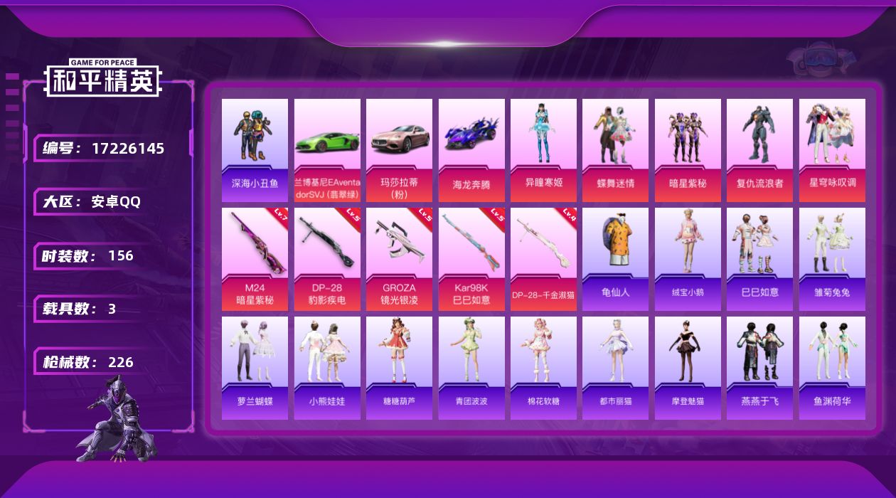 [17226145]安卓 手Q-5粉装-5特效枪-3载具-4粉色飞行器-66652热力值-4王牌印记-156套装-226枪皮 【热门品类】:套装-深海小丑鱼,套装-龟仙人 【粉色套装】:粉装-蝶舞迷情,粉装-暗星紫秘,角色-复仇流浪者,粉装-星穹咏叹调,角色-异瞳寒姬 【粉色枪皮等级】:GROZA-镜光银凌(五级),Kar98K-巳巳如意(五级),M24-暗星紫秘(七级),DP-28-千金淑猫(四级),DP-28-豹影疾电(五级) 【粉色载具】:兰博基尼Aventador SVJ(翡翠绿),玛莎拉蒂Ghibli(粉),海龙奔腾 【粉色枪皮】:GROZA-镜光银凌,Kar98K-巳巳如意,M24-暗星紫秘,DP-28-千金淑猫,DP-28-豹影疾电 【粉色飞行器】:春暖花开飞行器,天之羽翼飞行器,极意拳锋飞行器 【粉色降落伞】:春暖花开降落伞,梦幻火箭降落伞,银刃赛罗降落伞,暗星紫秘降落伞,碧影闪光降落伞,恐龙拽拽降落伞,垂柳戏鸭降落伞,精灵梦叶罗丽降落伞,拳皇·狂花道降落伞,千金淑猫降落伞,星穹咏叹调降落伞,幻彩电音降落伞,异瞳寒姬降落伞,炫彩糖果降落伞 【稀有套装】:套装-龟仙人,套装-绒宝小鹅,套装-巳巳如意,套装-雪国风尚,套装-炫彩糖果,套装-雏菊兔兔,套装-萝兰蝴蝶,套装-小熊娃娃,套装-糖糖葫芦,套装-青团波波,套装-棉花软糖,角色-都市丽猫,角色-摩登魅猫,套装-燕燕于飞,套装-鱼渊荷华,套装-紫幽梦,套装-蓝冰羽,套装-星影赞美诗,套装-霓虹热舞,套装-极速光影,角色-月烬之祷 【稀有枪皮】:AUG-冰晶雪宝,AKM-夜灯,AKM-奇异狩猎者,AKM-彩虹符号,AKM-影袭,AKM-春暖花开,AKM-破晓战魂,AKM-虎虎生威,AKM-霓虹街区,AKM-龙的传人,M16A4-幻世战舞者,M16A4-红色方程式,M16A4-蓝色火焰,M16A4-千金淑猫,SCAR-L-夜灯,SCAR-L-炫彩节奏,SCAR-L-玉兔迎春,SCAR-L-碧影闪光,SCAR-L-红色方程式,M416-暗星紫秘,M416-糯团青竹,M416-红色方程式,M416-蓝色火焰,GROZA-异彩先驱,GROZA-影袭,GROZA-春暖花开,GROZA-治愈之星,AUG-天降萌叽,AUG-耀粉歌者,QBZ-飞驰魅影,M762-天降萌叽,M762-瑞龙福将,Mk47-洛神天依,G36C-星穹咏叹调,A