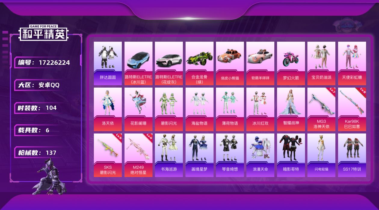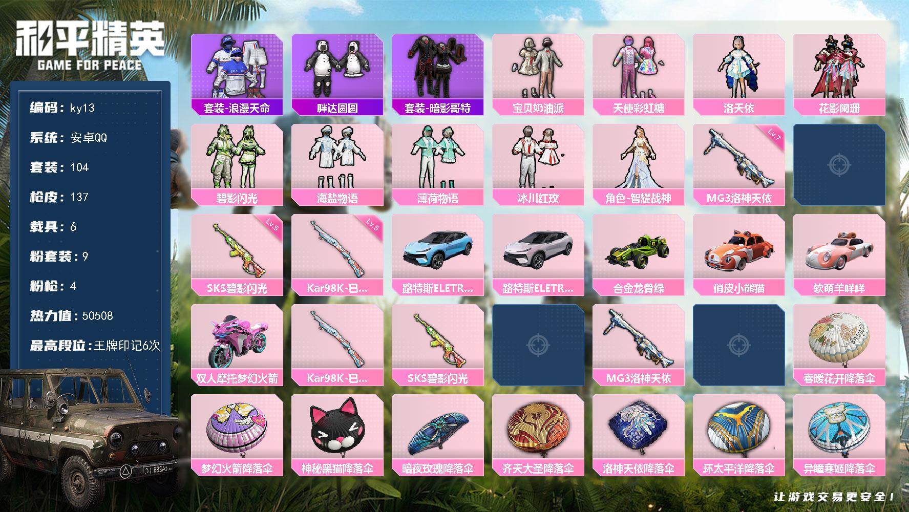 [17226224]安卓 手Q-9粉装-4特效枪-6载具-1粉色飞行器-50508热力值-6王牌印记-104套装-137枪皮