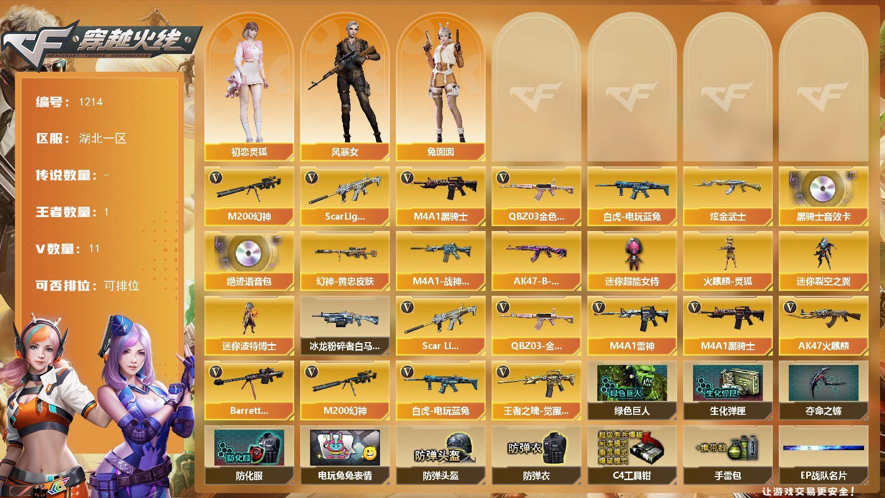 [17226453]湖北一区-12V-1王者武器数-1炫金武器数 【热门武器】:QBZ03-金色蔷薇,Scar Light-白虎,M200-幻神,白虎-电玩蓝兔,M4A1-黑骑士 【王者炫金武器】:炫金武士 【音效卡】:M4A1-黑骑士音效卡,绝迹语音包 【皮肤】:M200-幻神-黄忠皮肤,M4A1-战神赵云,AK47-B-常胜将军-曹操 【角色】:初恋灵狐,风暴女,兔囡囡 【人偶武器】:火麒麟-灵狐,迷你裂空之翼,迷你波特博士*2,迷你超能女侍 【挑战大师】:冰龙粉碎者-白马银枪 【英雄级武器】:AK47-火麒麟,M4A1-雷神,M4A1-黑骑士,Scar Light-白虎,QBZ03-金色蔷薇,王者之魄-觉醒版,白虎-电玩蓝兔,机械迷城-穹宇,Barrett-毁灭,M200-幻神 【道具】:绿色巨人,生化弹匣,夺命之镰,防化服*2,电玩兔兔表情,EP战队名片,防弹头盔*2,防弹衣*2,C4工具钳*2,手雷包*2 【特殊枪械】:1白虎,1黑骑士