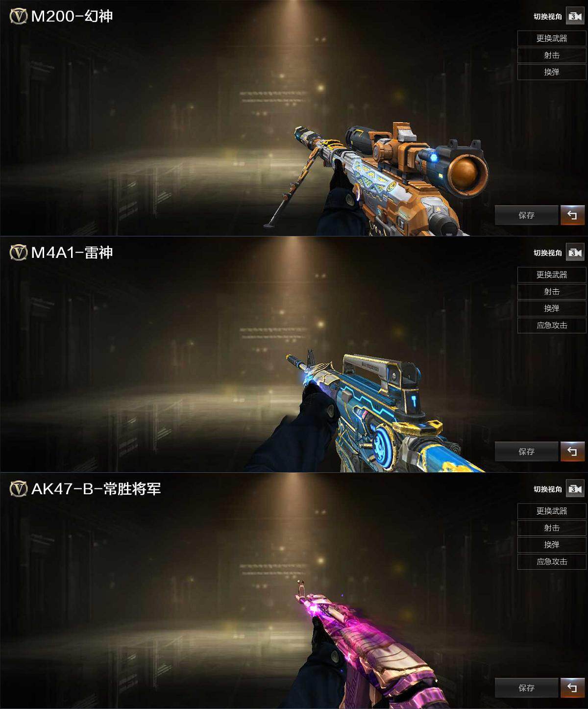 【皮肤】:M200-幻神-黄忠皮肤,M4A1-战神赵云,AK47-B-常胜将军-曹操