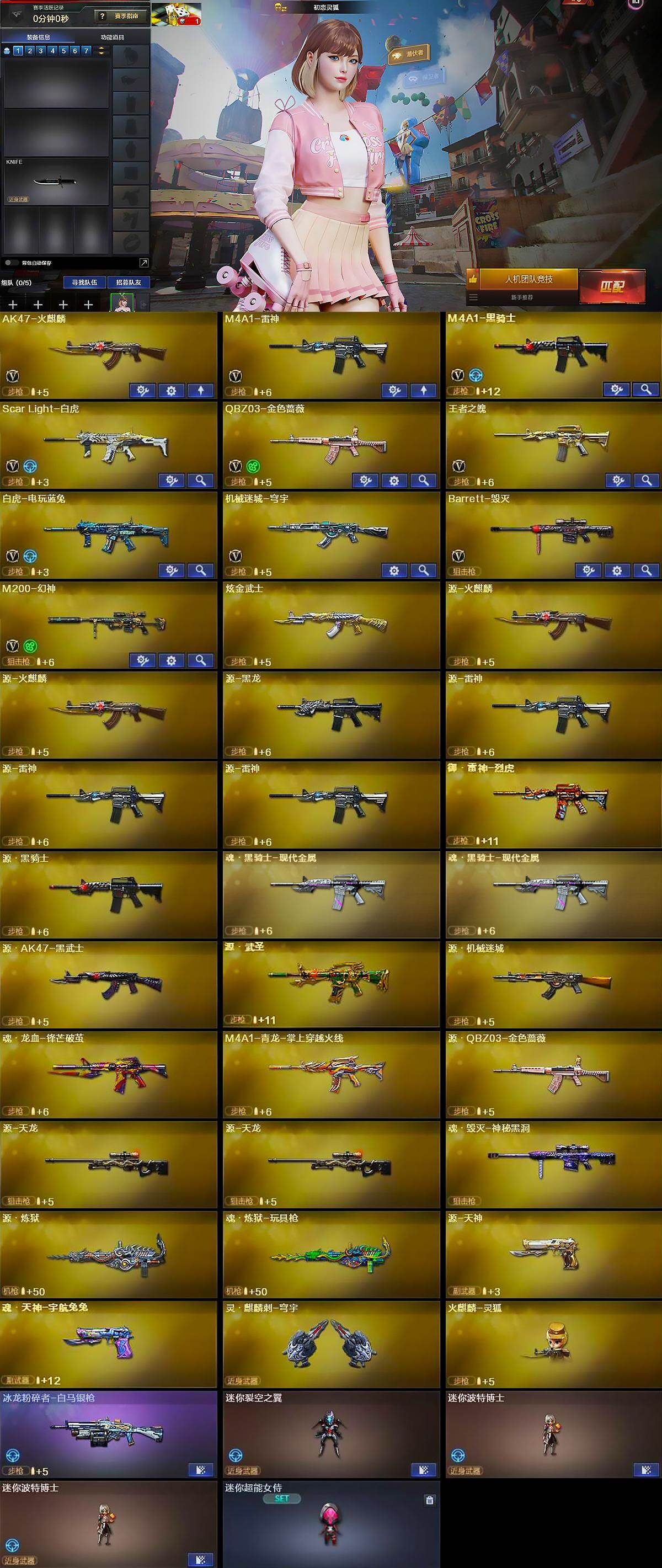 【英雄级武器】:AK47-火麒麟,M4A1-雷神,M4A1-黑骑士,Scar Light-白虎,QBZ03-金色蔷薇,王者之魄-觉醒版,白虎-电玩蓝兔,机械迷城-穹宇,Barrett-毁灭,M200-幻神
