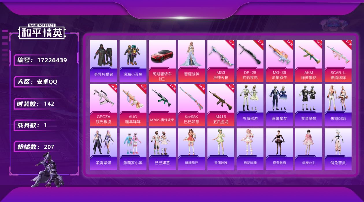 [17226439]安卓 手Q-1粉装-11特效枪-1载具-2粉色飞行器-64410热力值-9王牌印记-142套装-207枪皮 【热门品类】:套装-深海小丑鱼,套装-奇异狩猎者 【粉色套装】:角色-智耀战神 【粉色枪皮等级】:AKM-绿萝繁花(五级),SCAR-L-锦绣绵绵(五级),M416-五爪金龙(四级),GROZA-镜光银凌(五级),AUG-暖羊咩咩(五级),M762-青锋波束(五级),AKS-74U-森灵之息(五级),Kar98K-巳巳如意(五级),DP-28-豹影疾电(五级),MG3-洛神天依(七级),MG-36-沧焰双生(五级) 【粉色载具】:阿斯顿马丁DBS(红) 【粉色枪皮】:AKM-绿萝繁花,SCAR-L-锦绣绵绵,M416-五爪金龙,GROZA-镜光银凌,AUG-暖羊咩咩,M762-青锋波束,AKS-74U-森灵之息,Kar98K-巳巳如意,DP-28-豹影疾电,MG3-洛神天依,MG-36-沧焰双生 【粉色飞行器】:齐天大圣飞行器 【粉色降落伞】:梦幻火箭降落伞,四圣焕新降落伞,锦绣火鲤降落伞,阿狸红降落伞,洛神天依降落伞,千金淑猫降落伞,炫彩糖果降落伞 【稀有套装】:套装-巳巳如意,套装-雪国风尚,套装-炫彩糖果,套装-糖糖葫芦,套装-青团波波,套装-棉花软糖,角色-摩登魅猫,角色-临安公主,角色-俏兔智灵,角色-光矢逐梦,套装-燕燕于飞,套装-鱼渊荷华,套装-朱霞炽焰,套装-凌霄紫焰,套装-书海巡游,套装-画境星梦,套装-琴音绮想 【稀有枪皮】:AUG-冰晶雪宝,AKM-夜灯,AKM-缤纷海域,AKM-萌趣颜团子,AKM-虎虎生威,AKM-阿狸红,AKM-霓虹街区,AKM-龙的传人,M16A4-幻世战舞者,M16A4-机械英豪,M16A4-红色方程式,M16A4-千金淑猫,SCAR-L-炫彩节奏,SCAR-L-玉兔迎春,SCAR-L-红色方程式,M416-糯团青竹,M416-红色方程式,M416-绯红前夜,GROZA-治愈之星,AUG-耀粉歌者,AUG-闲梦青缨,QBZ-原初圣火,QBZ-彩虹符号,QBZ-洛神天依,M762-天星战神,M762-天降萌叽,M762-牛气冲天,M762-瑞龙福将,M762-镭射皇者,Mk47-洛神天依,G36C-暗夜玫瑰,AC-VAL-天降萌叽,AC-VAL-快闪甜心,蜜獾-娇憨猪猪,ACE32-画境星梦,ARX-凌霄紫焰,U