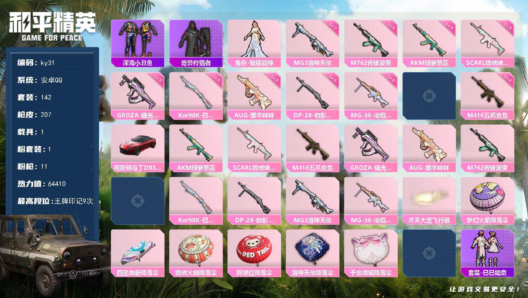 [17226439]安卓 手Q-1粉装-11特效枪-1载具-2粉色飞行器-64410热力值-9王牌印记-142套装-207枪皮