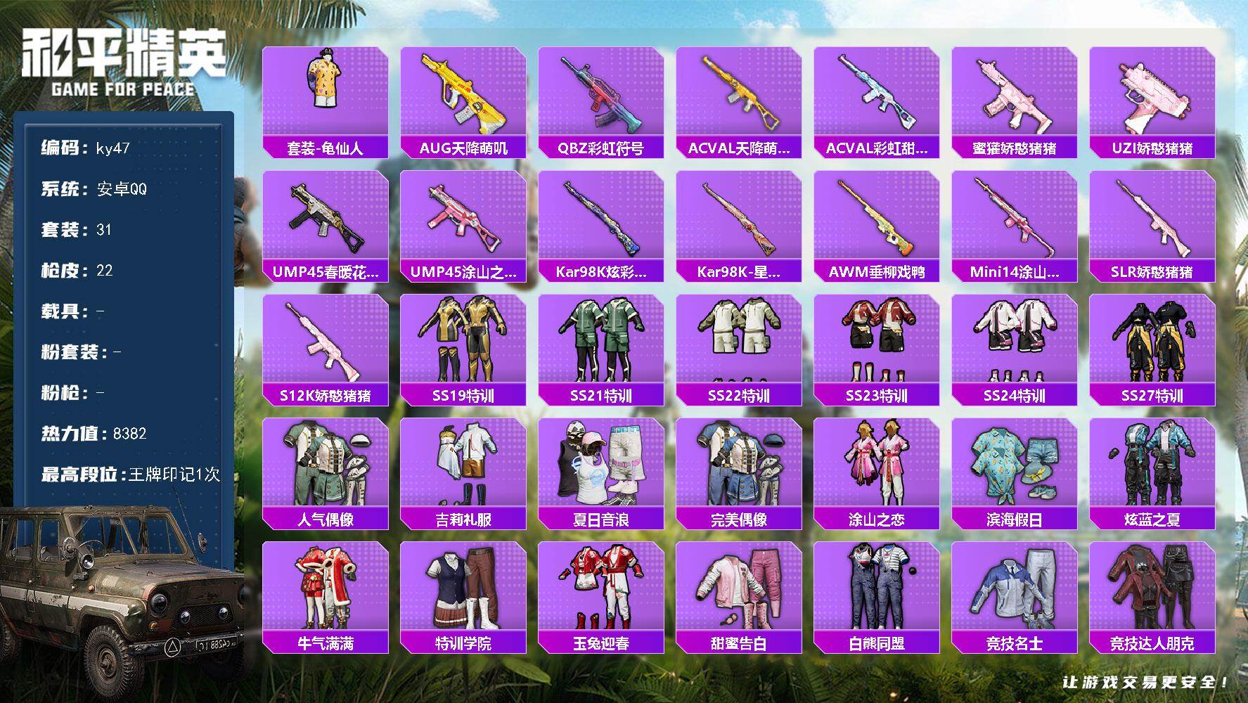 [17226615]安卓 手Q-0粉装-0特效枪-0载具-0粉色飞行器-8382热力值-1王牌印记-31套装-22枪皮 【热门品类】:套装-龟仙人 【稀有套装】:套装-龟仙人 【稀有枪皮】:AUG-天降萌叽,QBZ-彩虹符号,AC-VAL-天降萌叽,AC-VAL-彩虹甜喵,蜜獾-娇憨猪猪,UZI-娇憨猪猪,UMP45-春暖花开,UMP45-涂山之恋,Kar98K-炫彩节奏,Kar98K-星穹咏叹调,AWM-垂柳戏鸭,Mini14-涂山之恋,SLR-娇憨猪猪,S12K-娇憨猪猪 【其他套装】:套装-SS19特训,套装-SS21特训,套装-SS22特训,套装-SS23特训,套装-SS24特训,套装-SS27特训,套装-人气偶像,套装-吉莉礼服,套装-夏日音浪,套装-完美偶像,套装-涂山之恋,套装-滨海假日,套装-炫蓝之夏,套装-牛气满满,套装-特训学院,套装-玉兔迎春,套装-甜蜜告白,套装-白熊同盟,套装-竞技名士,套装-竞技达人朋克,套装-耀粉歌者,套装-都市魅力,套装-长空猛禽,套装-霓虹街区,套装-魅力单车,套装-鹤鸣,套装-麻辣教官,套装-龟仙人,套装-娇憨猪猪,套装-萌趣咩咩 【营地ID】:902762054