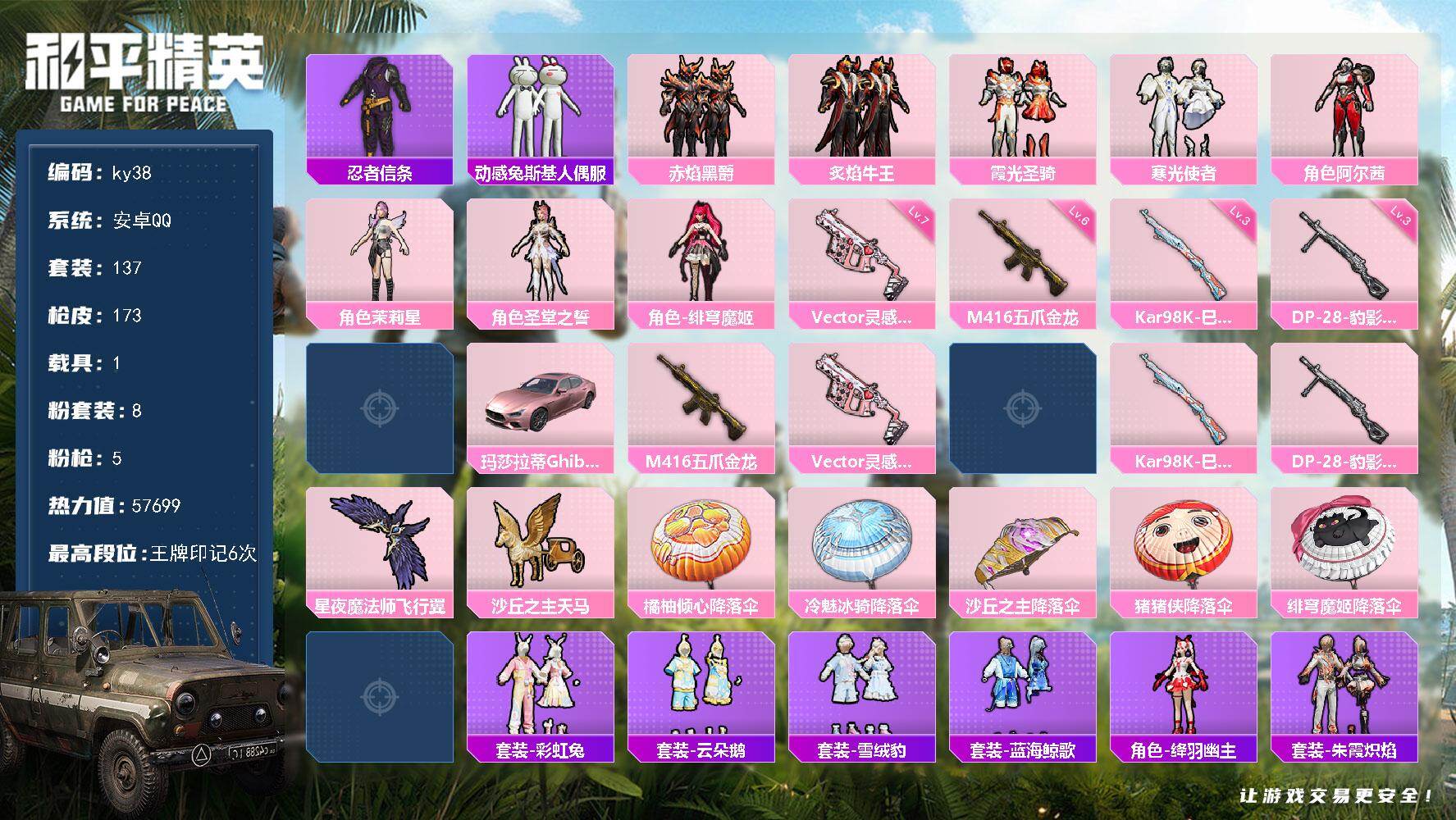 [17226558]安卓 手Q-8粉装-5特效枪-1载具-3粉色飞行器-57699热力值-6王牌印记-137套装-173枪皮 【热门品类】:套装-忍者信条,套装-动感兔斯基人偶服 【粉色套装】:粉装-赤焰黑爵,粉装-炙焰牛王,粉装-霞光圣骑,粉装-寒光使者,角色-阿尔茜,角色-茉莉星,角色-圣堂之誓,角色-绯穹魔姬 【粉色枪皮等级】:M416-五爪金龙(六级),Vector-灵感创作师(七级),AKS-74U-森灵之息(三级),Kar98K-巳巳如意(三级),DP-28-豹影疾电(三级) 【粉色载具】:玛莎拉蒂Ghibli(粉) 【粉色枪皮】:M416-五爪金龙,Vector-灵感创作师,AKS-74U-森灵之息,Kar98K-巳巳如意,DP-28-豹影疾电 【粉色飞行器】:星夜魔法师飞行翼,沙丘之主天马 【粉色降落伞】:橘柚倾心降落伞,冷魅冰骑降落伞,沙丘之主降落伞,猪猪侠降落伞,绯穹魔姬降落伞,炫彩糖果降落伞 【稀有套装】:套装-炫彩糖果,套装-彩虹兔,套装-云朵鹅,套装-雪绒豹,套装-蓝海鲸歌,角色-绛羽幽主,套装-朱霞炽焰,套装-凌霄紫焰,角色-绯色魅影 【稀有枪皮】:AUG-冰晶雪宝,AKM-彩虹符号,AKM-影袭,AKM-春暖花开,AKM-灼热熔岩,AKM-王牌投手,AKM-破晓战魂,AKM-虎虎生威,AKM-霓虹街区,AKM-龙的传人,M16A4-凝视深渊,M16A4-幻世战舞者,M16A4-甜心亚梦,SCAR-L-暗夜玫瑰,SCAR-L-炫彩节奏,SCAR-L-红色方程式,SCAR-L-银河战甲,SCAR-L-青丘仙客,SCAR-L-冷漠罗丽,M416-月影鸳鸯,M416-神秘黑猫,M416-红色方程式,M416-蓝色火焰,GROZA-2B战斗服款,GROZA-异彩先驱,GROZA-影袭,GROZA-懵萌河马,GROZA-黑色刀锋,AUG-2P战斗服款,AUG-天降萌叽,AUG-灵符少年,QBZ-彩虹符号,QBZ-未来歌姬,QBZ-飞驰魅影,M762-拳皇97,M762-橘柚倾心,M762-瑞龙福将,M762-云朵鹅,G36C-冷魅冰骑,G36C-懵萌河马,G36C-青丘仙客,AC-VAL-天降萌叽,AC-VAL-甜心亚梦,蜜獾-绯穹魔姬,ARX-凌霄紫焰,UZI-天降萌叽,UZI-幻影战神,UZI-影袭,UMP45-炫光之旅,UMP45-猪猪侠,UMP45-生命誓言