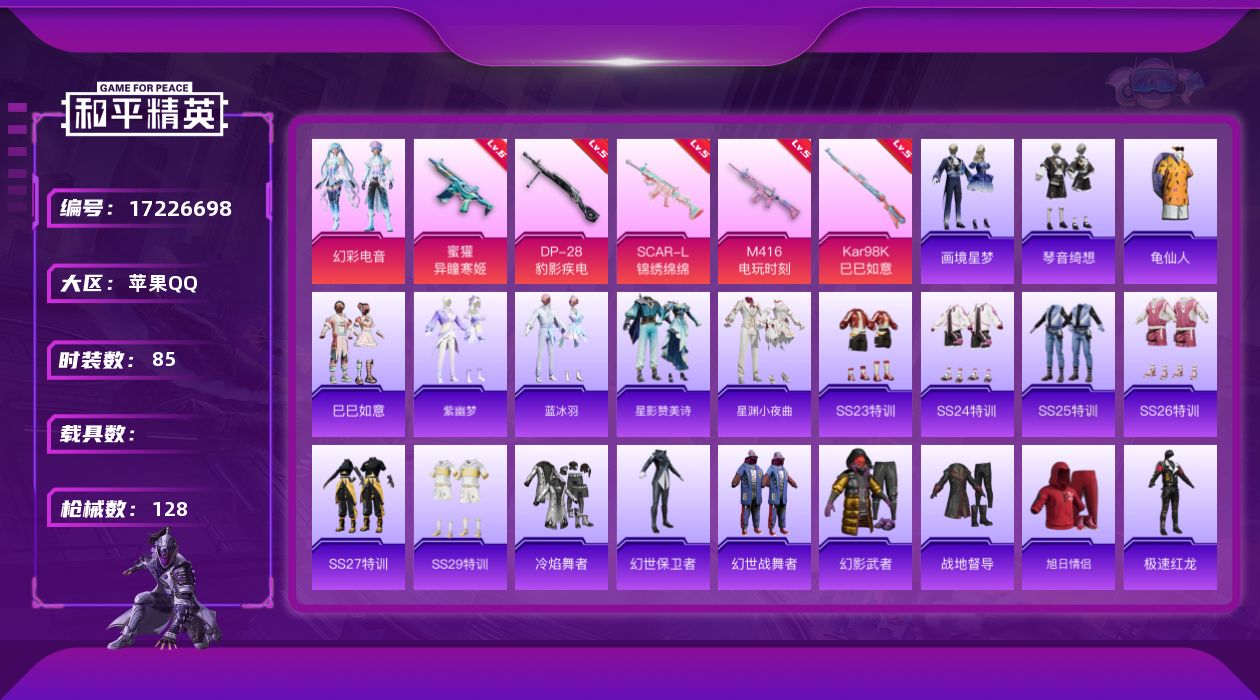 [17226698]苹果 手Q-1粉装-6特效枪-0载具-2粉色飞行器-35866热力值-3王牌印记-85套装-128枪皮 【热门品类】:套装-龟仙人 【粉色套装】:粉装-幻彩电音 【粉色枪皮等级】:SCAR-L-锦绣绵绵(五级),M416-电玩时刻(五级),蜜獾-异瞳寒姬(六级),AKS-74U-森灵之息(五级),Kar98K-巳巳如意(五级),DP-28-豹影疾电(五级) 【粉色枪皮】:SCAR-L-锦绣绵绵,M416-电玩时刻,蜜獾-异瞳寒姬,AKS-74U-森灵之息,Kar98K-巳巳如意,DP-28-豹影疾电 【粉色飞行器】:极意拳锋飞行器 【粉色降落伞】:星之彼岸降落伞,怪笑疯兔降落伞,暗夜玫瑰降落伞,猪猪侠降落伞,星穹咏叹调降落伞,异瞳寒姬降落伞,炫彩糖果降落伞 【稀有套装】:套装-龟仙人,套装-巳巳如意,套装-炫彩糖果,套装-紫幽梦,套装-蓝冰羽,套装-星影赞美诗,套装-星渊小夜曲,套装-画境星梦,套装-琴音绮想 【稀有枪皮】:AKM-破晓战魂,AKM-龙的传人,SCAR-L-夜灯,SCAR-L-红色方程式,SCAR-L-黄金龙骨,M416-糯团青竹,M416-红色方程式,M416-绯红前夜,M416-蓝色火焰,GROZA-懵萌河马,AUG-耀粉歌者,QBZ-未来歌姬,M762-天降萌叽,G36C-懵萌河马,AC-VAL-快闪甜心,蜜獾-天降萌叽,ACE32-画境星梦,UZI-啾咪啾咪,UMP45-夜灯,Vector-焰鹰斗篷,汤姆逊-天降萌叽,汤姆逊-环太平洋,MP5K-画境星梦,P90-快闪甜心,P90-甜蜜旋律,Kar98K-星穹咏叹调,AWM-焰鹰斗篷,SKS-炫彩节奏,VSS-星之彼岸,莫辛纳甘-懵萌河马,M417-惊鸿侠骨,MK20-H-快闪甜心,M200-惊鸿侠骨,M1加兰德-画境星梦,S686-巳巳如意,S12K-玩趣呆呆,S12K-夜灯,DBS-焰鹰斗篷,AA12-G-画境星梦,M249-彩虹符号,M249-星之彼岸,M249-糯团青竹,DP-28-焰鹰斗篷,MG3-惊鸿侠骨,MG3-萝萝小趴兔,PKM-懵萌河马,短管霰弹-星穹咏叹调,沙漠之鹰-快闪甜心,爆炸猎弓-惊鸿侠骨,平底锅-画境星梦 【其他套装】:套装-SS23特训,套装-SS24特训,套装-SS25特训,套装-SS26特训,套装-SS27特训,套装-SS29特训,套装-冷焰舞者,套装-幻世