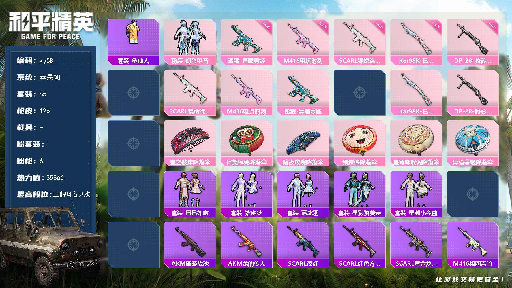 [17226698]苹果 手Q-1粉装-6特效枪-0载具-2粉色飞行器-35866热力值-3王牌印记-85套装-128枪皮