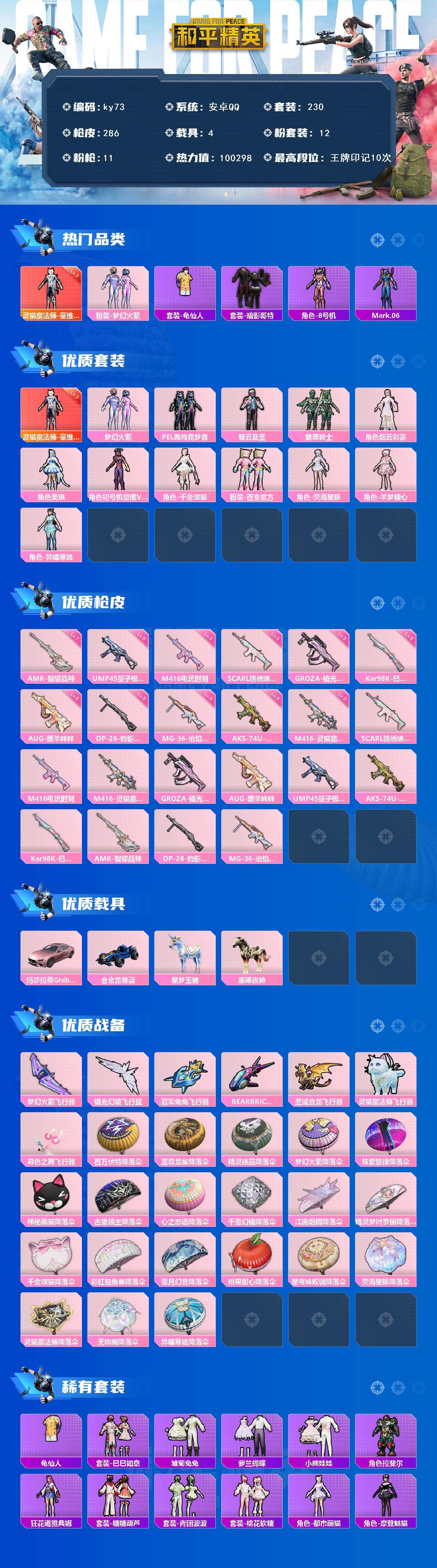 [17226923]安卓 手Q-1神装-12粉装-11特效枪-4载具-7粉色飞行器-100298热力值-10王牌印记-230套装-286枪皮 【红色神装等级】:灵猫魔法师-塞维尔(三级) 【红色角色神装】:灵猫魔法师-塞维尔 【热门品类】:粉装-梦幻火箭,套装-龟仙人,套装-暗影哥特,角色-8号机,角色-Mark.06 【粉色套装】:粉装-梦幻火箭,粉装-PEL轰鸣竞梦者,粉装-彗云及圣,粉装-翡翠骑士,角色-烟云彩露,角色-美琪,角色-初号机 觉醒Ver.,角色-千金淑猫,粉装-百变魔方,角色-荧海星豚,角色-羊梦糖心,角色-异瞳寒姬 【粉色枪皮等级】:SCAR-L-锦绣绵绵(五级),M416-电玩时刻(五级),M416-灵猫魔法师(三级),GROZA-镜光银凌(五级),AUG-暖羊咩咩(五级),UMP45-量子极限(五级),AKS-74U-森灵之息(五级),Kar98K-巳巳如意(五级),AMR-智耀战神(七级),DP-28-豹影疾电(五级),MG-36-沧焰双生(五级) 【粉色载具】:玛莎拉蒂Ghibli(粉),合金龙骨(蓝),星梦玉骢,黑曜夜骑 【粉色枪皮】:SCAR-L-锦绣绵绵,M416-电玩时刻,M416-灵猫魔法师,GROZA-镜光银凌,AUG-暖羊咩咩,UMP45-量子极限,AKS-74U-森灵之息,Kar98K-巳巳如意,AMR-智耀战神,DP-28-豹影疾电,MG-36-沧焰双生 【粉色飞行器】:梦幻火箭飞行器,镜光幻境飞行翼,冠军兔兔飞行器,BEARBRICK飞行器,圣域金龙飞行器,灵猫魔法师飞行器,暮色之舞飞行器 【粉色降落伞】:百万伏特降落伞,至尊龙雀降落伞,精灵迷巫降落伞,梦幻火箭降落伞,炫紫旋律降落伞,神秘黑猫降落伞,古堡领主降落伞,心之恋语降落伞,千面幻镜降落伞,江南烟雨降落伞,精灵梦叶罗丽降落伞,千金淑猫降落伞,彩虹独角兽降落伞,雪月幻音降落伞,绯果甜心降落伞,星穹咏叹调降落伞,荧海星豚降落伞,灵猫魔法师降落伞,无垠阁降落伞,异瞳寒姬降落伞 【稀有套装】:套装-龟仙人,套装-巳巳如意,套装-雏菊兔兔,套装-萝兰蝴蝶,套装-小熊娃娃,角色-拉斐尔,角色-狂花道·雅典娜,套装-糖糖葫芦,套装-青团波波,套装-棉花软糖,角色-都市丽猫,角色-摩登魅猫,套装-燕燕于飞,套装-鱼渊荷华,角色-海琴烟,角色-蜜桃派对,角色-冷霜之星,套装-粉恋花,套装-紫幽梦