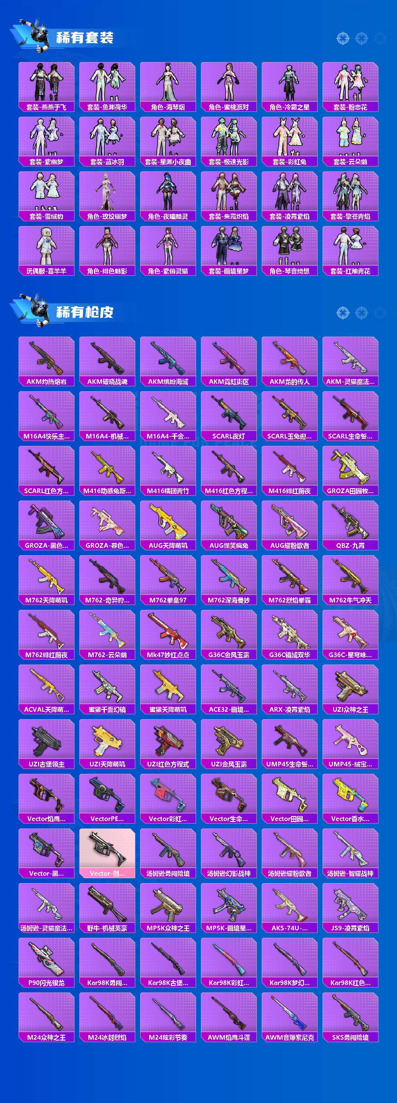 【粉色枪皮】:SCAR-L-锦绣绵绵,M416-电玩时刻,M416-灵猫魔法师,GROZA-镜光银凌,AUG-暖羊咩咩,UMP45-量子极限,AKS-74U-森灵之息,Kar98K-巳巳如意,AMR-智耀战神,DP-28-豹影疾电,MG-36-沧焰双生