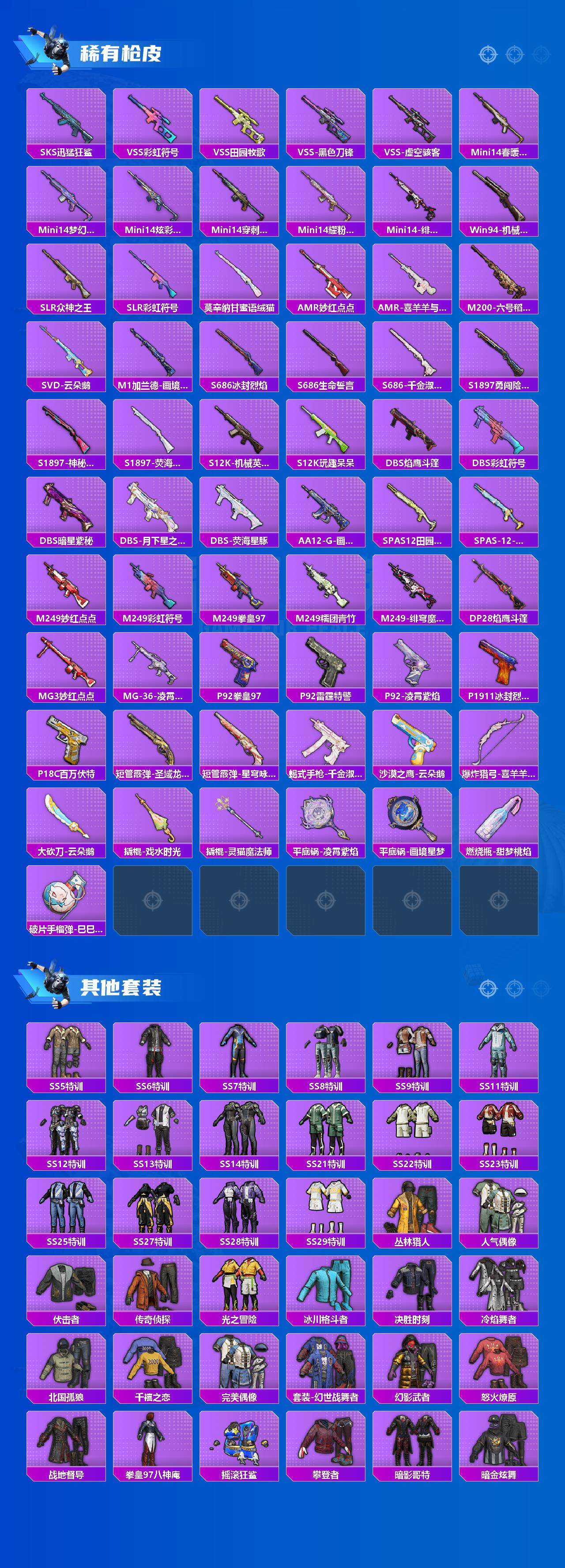 - [12204265]6粉装 9特效枪 1载具 13印记 可二次 可修改实名 身法装备:暗影哥特(红眼罩),Mark.06(新蓝螳螂),巡查衣(绝对防御上衣) 优质装备:星河领航(磐石银),巡查员衣服(绝对防御上衣),巡查衣(绝对防御上衣),M416五爪金龙,梦幻火箭(新101)(新火箭少女101粉色套装),AKM梦之光华,AKM绿萝繁花,SCAR-L-锦绣绵绵,七级M416-五爪金龙,UMP45量子极限,GROZA-镜光银凌,月影灵韵,AUG-暖羊咩咩,Kar98K-巳巳如意 热门装扮:第五大道,炫光之旅,烟云彩露,光极星,鹰眼刺客,暗夜魅影 稀有枪皮:DP-28-豹影疾电 五级特效枪:五级UMP45-量子极限,五级GROZA-镜光银凌,五级Kar98K-巳巳如意,五级DP-28-豹影疾电,五级AUG-暖羊咩咩,五级SCAR-L-锦绣绵绵,五级AKM-绿萝繁花,五级AKM-梦之光华 紫色装扮:幻彩翩翩,SS23特训,妙红点点,SS30特训套装,SS31特训套装,SS33特训套装,飞狐塔尔斯,SS21特训,田园牧歌,轻风白浪,SS22特训,香榭午后,冷焰舞者,北国孤狼,吉莉礼服,夏日倾情,夏日音浪,幻影武者,冰川特警,萌趣咩咩,SS5特训,人气偶像,六六大吉,娇憨猪猪,瑞龙福将,团圆交子,SS17特训,萌趣颜团子,SS15特训,SS20特训,浑天鲲鹏,甜心亚梦,虚音幻奏,SS18特训,英勇保护者,飞驰魅影,音速流光,极速竞梦,SS19特训,战地菁英,黄色名流,风暴特警,骑行爱好者,魅力单车,黄色运动,黎明保卫者,黑色伏地魔,龙的传人,龟仙人,冰河战士,龙魂突击队,蝶变,霓虹街区,酷潮明星,超能勇士,跃动心情,酒红色名流,酷萌兔限定,长空猛禽,雪山精英,绛羽幽主,深蓝色名流,湖蓝色名流,灰色格斗者,炫蓝之夏,燃烧卡路里,牛气冲天,牛气满满,海岛探路者,战地督导,格斗先锋,沙漠兵团,血色贵族,竞技达人朋克,绮丽涂鸦,缤纷果语,蓝彩潮人,蓝色运动,虎虎生威吉莉,竞技勇士朋克,特战装甲,猛禽,王牌教练,甜蜜告白,空岛之星,疯狂小兔子,白色伏地魔,破晓战魂,破蛋小黄鸡,福星高照,萝兰蝴蝶,SS29特训,极冰使者,小熊娃娃,星途旅人,雏菊兔兔,热情海星,曼妙人鱼,SS28特训,卖崽青蛙,湖畔霞光,铁血战翼,Mark.06(新蓝螳螂),鱼渊荷华,玉兔迎春,燕燕于飞,巳巳如意,烈火街头,憨乐熊二,智