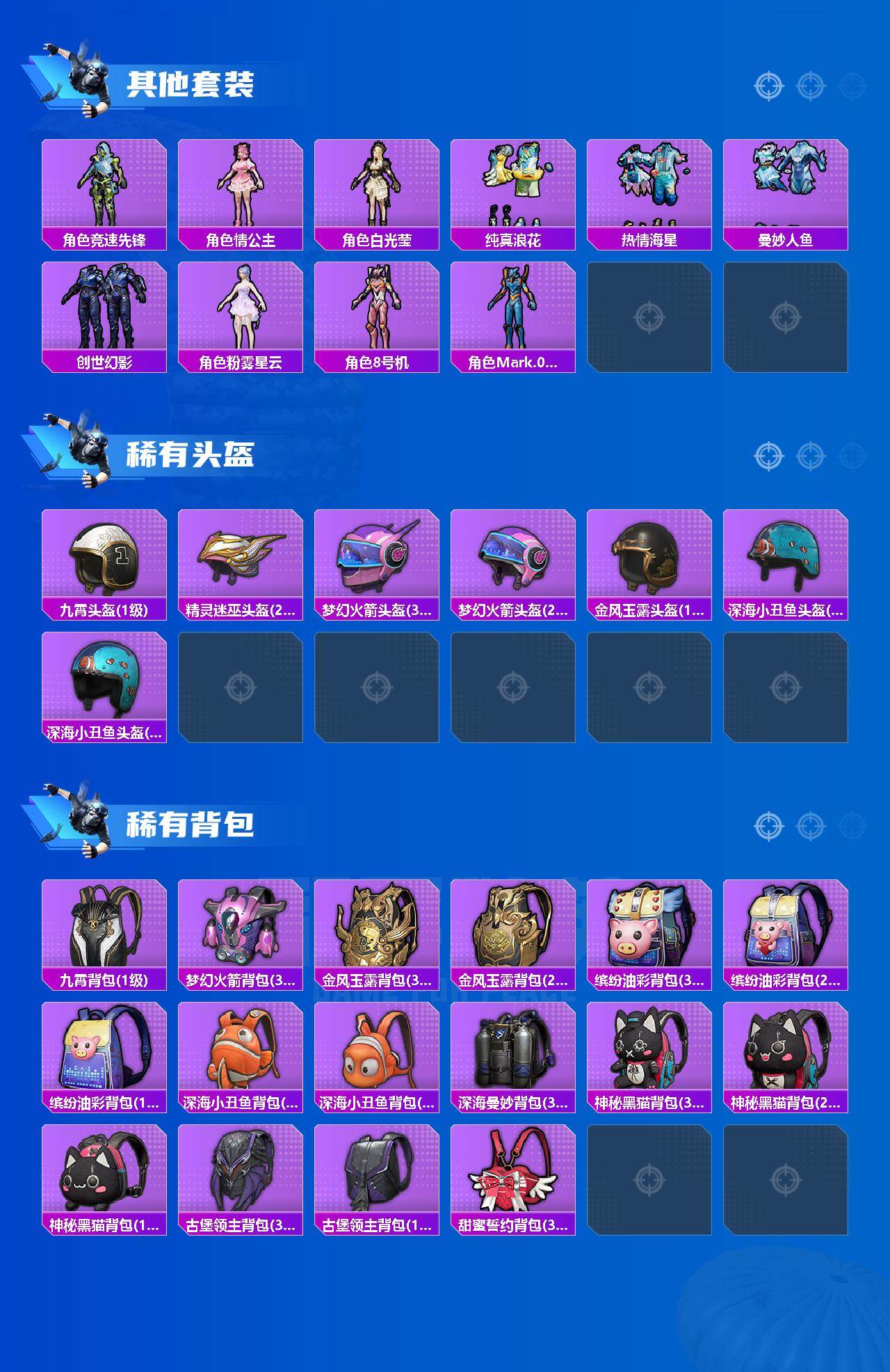 套装-梦幻火箭,套装-PEL轰鸣竞梦者,套装-彗云及圣,套装-翡翠骑士,角色-烟云彩露,角色-美琪,角色-觉醒初号机,角色-千金淑猫,套装-迅捷狂鲨