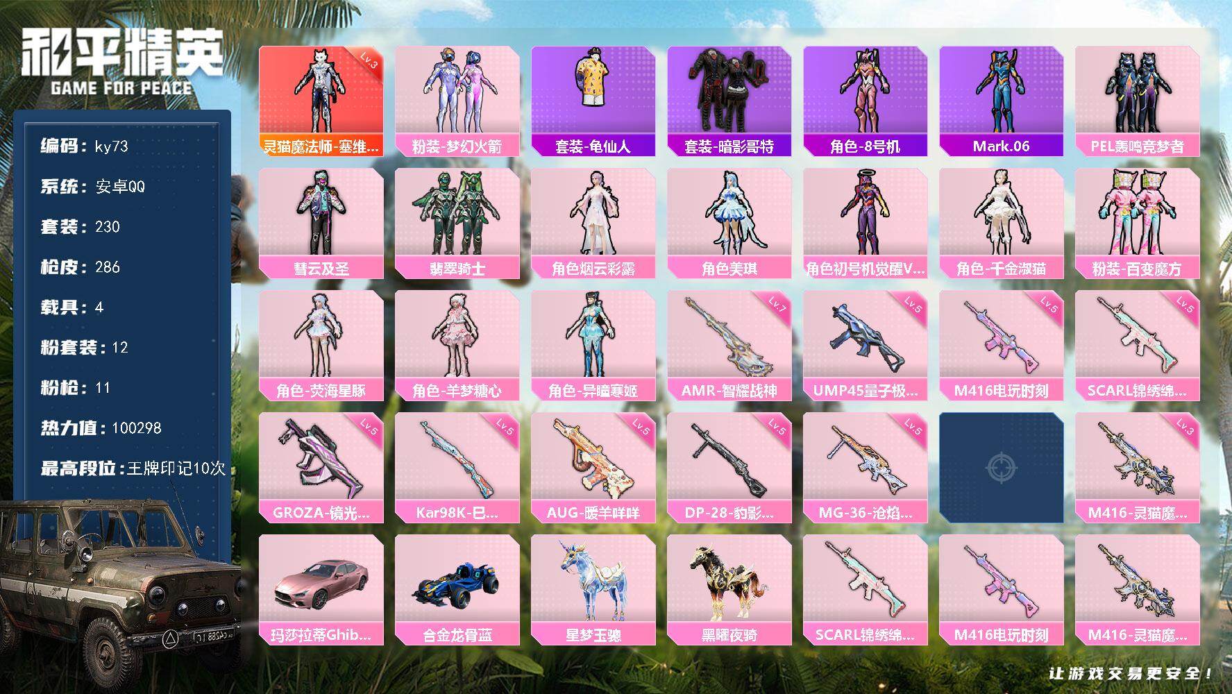 [17226923]安卓 手Q-1神装-12粉装-11特效枪-4载具-7粉色飞行器-100298热力值-10王牌印记-230套装-286枪皮