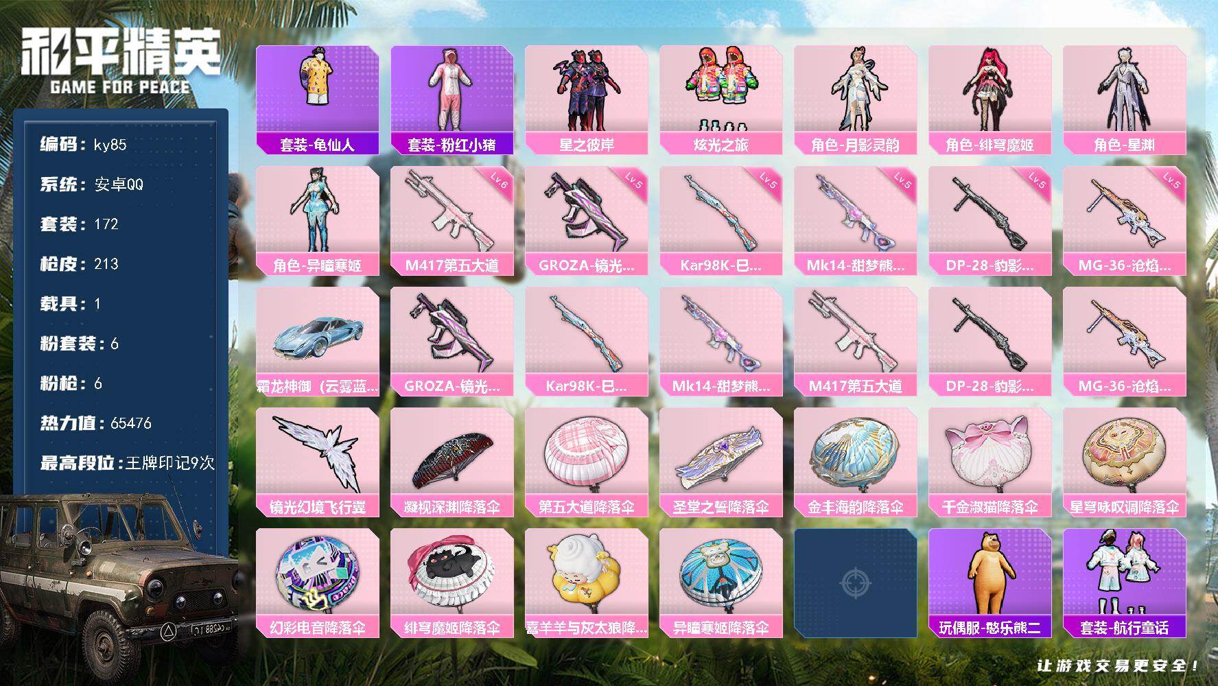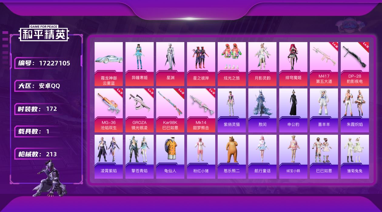 [17227105]安卓 手Q-6粉装-6特效枪-1载具-2粉色飞行器-65476热力值-9王牌印记-172套装-213枪皮