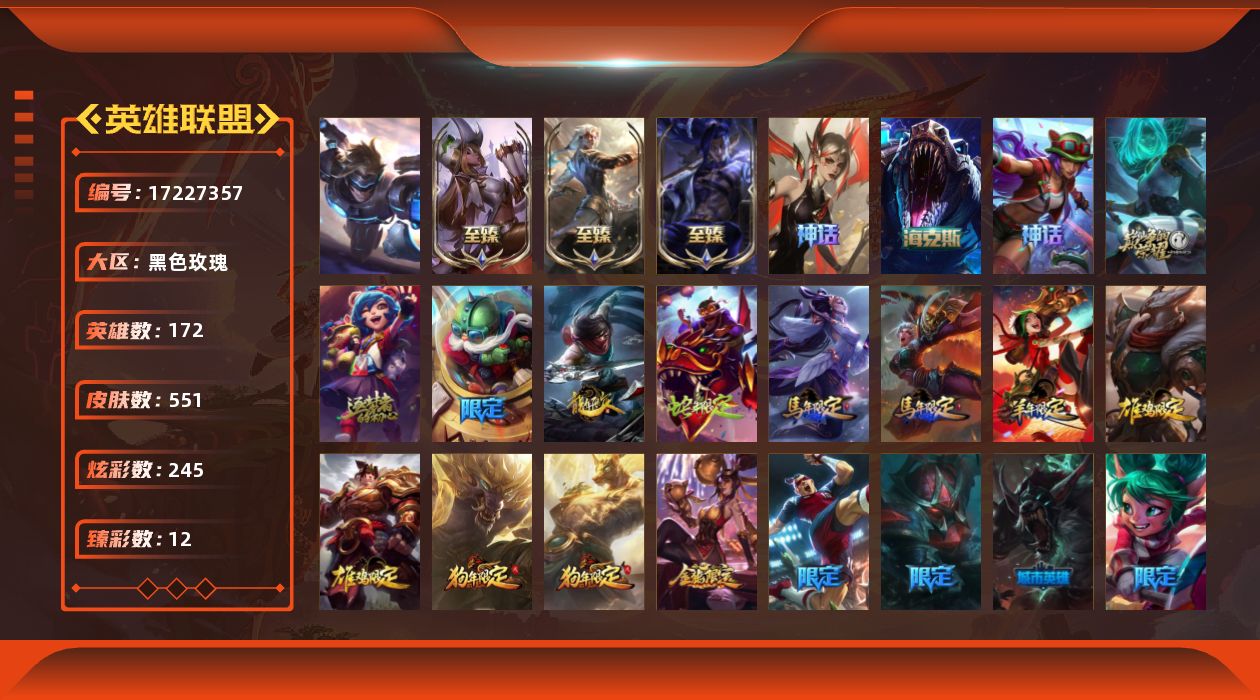 [17227357]【店主推荐捡漏号】青铜段位-172英雄-551皮肤-245炫彩-1终极-9神话-87限定-52传说-143史诗