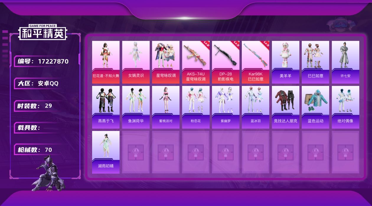 [17227870]安卓 手Q-3粉装-3特效枪-0载具-0粉色飞行器-18699热力值-1王牌印记-29套装-70枪皮
