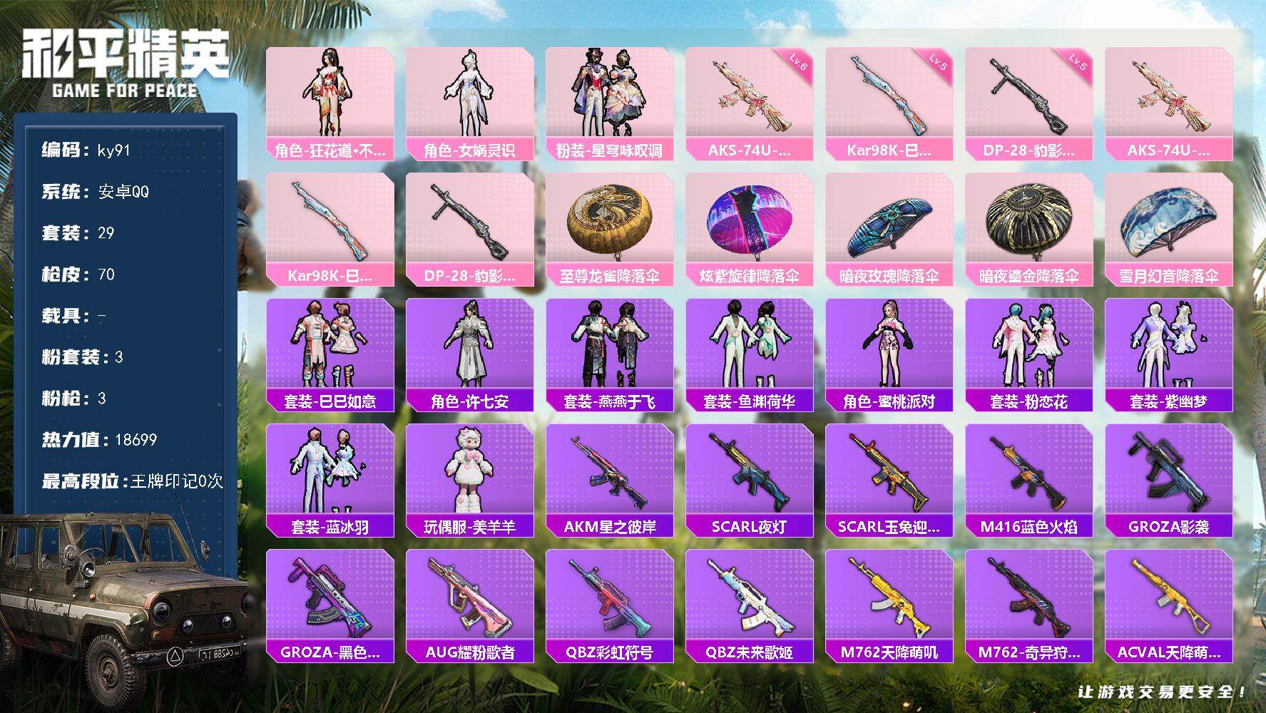 [17227870]安卓 手Q-3粉装-3特效枪-0载具-0粉色飞行器-18699热力值-1王牌印记-29套装-70枪皮 【粉色套装】:角色-狂花道·不知火舞,角色-女娲灵识,粉装-星穹咏叹调 【粉色枪皮等级】:AKS-74U-星穹咏叹调(六级),Kar98K-巳巳如意(五级),DP-28-豹影疾电(五级) 【粉色枪皮】:AKS-74U-星穹咏叹调,Kar98K-巳巳如意,DP-28-豹影疾电 【粉色降落伞】:至尊龙雀降落伞,炫紫旋律降落伞,暗夜玫瑰降落伞,暗夜鎏金降落伞,雪月幻音降落伞 【稀有套装】:套装-巳巳如意,角色-许七安,套装-燕燕于飞,套装-鱼渊荷华,角色-蜜桃派对,套装-粉恋花,套装-紫幽梦,套装-蓝冰羽,玩偶服-美羊羊 【稀有枪皮】:AKM-星之彼岸,SCAR-L-夜灯,SCAR-L-玉兔迎春,M416-蓝色火焰,GROZA-影袭,GROZA-黑色刀锋,AUG-耀粉歌者,QBZ-彩虹符号,QBZ-未来歌姬,M762-天降萌叽,M762-奇异狩猎者,AC-VAL-天降萌叽,UZI-天降萌叽,UZI-红色方程式,UMP45-蓝色火焰,汤姆逊-樱桃泡泡,汤姆逊-智耀战神,P90-巳巳如意,Mini14-耀粉歌者,Mk14-治愈之星,AMR-喜羊羊与灰太狼,AMR-鬼刀,S686-生命誓言,S686-千金淑猫,S12K-智耀战神,DBS-幻彩电音,DBS-月影灵韵,DP-28-彩虹符号,MG3-惊鸿侠骨,爆炸猎弓-喜羊羊与灰太狼,大砍刀-鬼刀,破片手榴弹-巳巳如意 【其他套装】:套装-竞技达人朋克,套装-蓝色运动,套装-绝对偶像,角色-湖雨初晴 【营地ID】:926526742