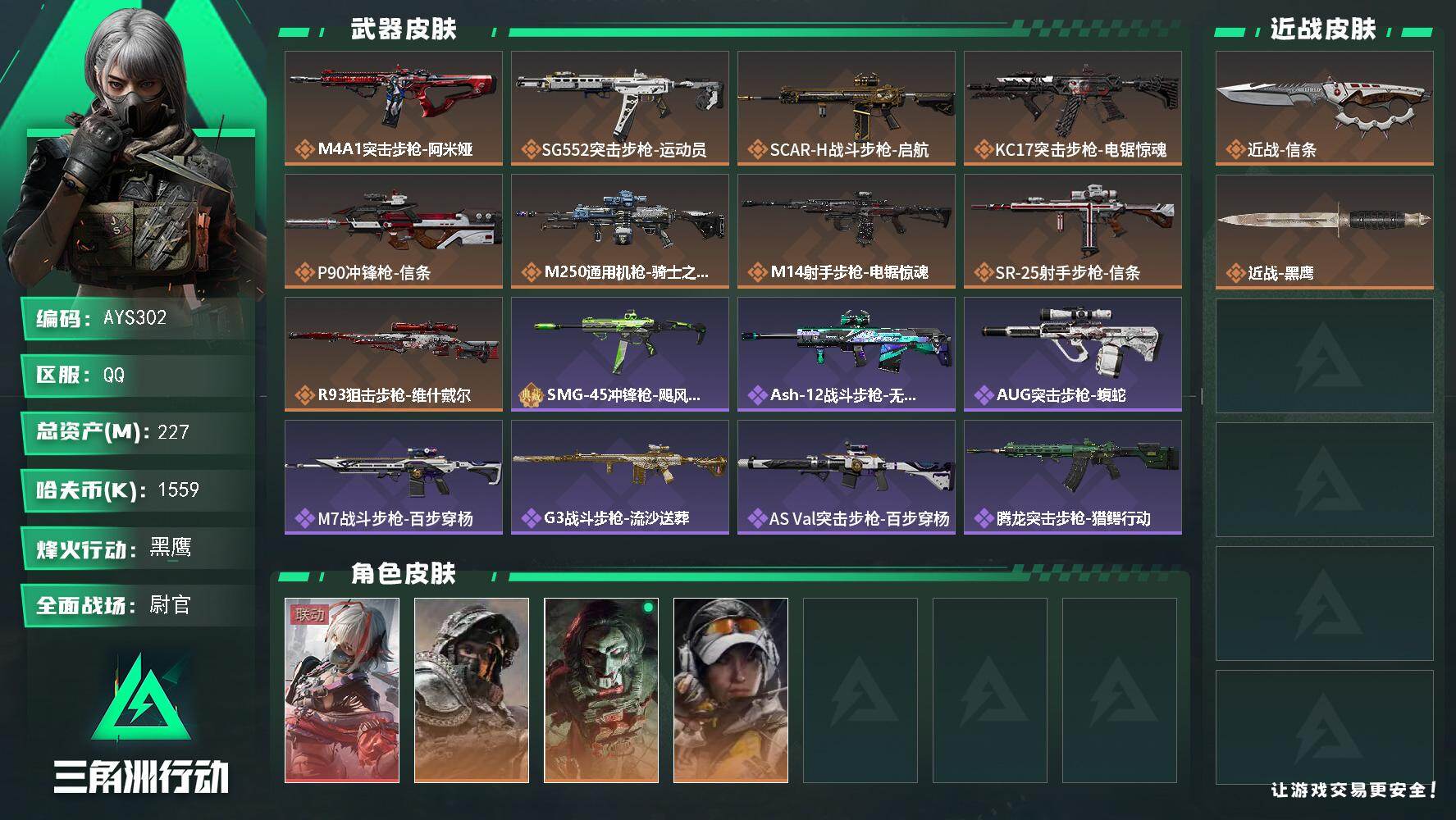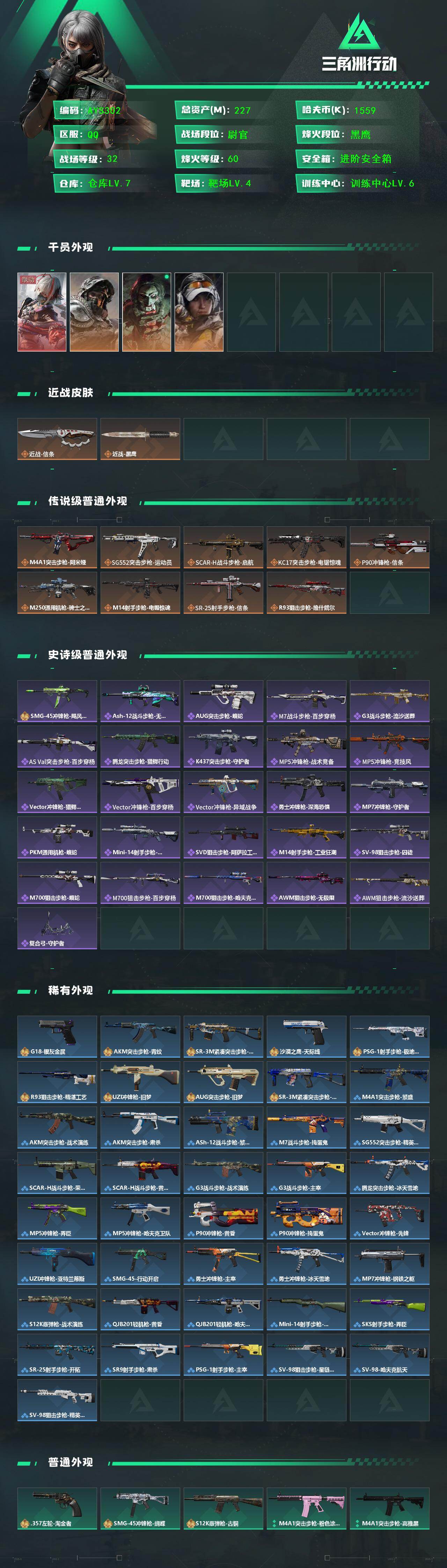 [17228367]227m总资产-1559k哈伏币-60烽火等级-黑鹰-32战场等级-尉官 【干员外观】:骇爪-维什戴尔,深蓝-不破誓约,红狼-电锯惊魂,露娜-金牌射手 【近战皮肤】:近战-信条,近战-黑鹰 【传说外观】:M4A1突击步枪-阿米娅,SG552突击步枪-运动员,SCAR-H战斗步枪-启航,KC17突击步枪-电锯惊魂,P90冲锋枪-信条,M250通用机枪-骑士之心,M14射手步枪-电锯惊魂,SR-25射手步枪-信条,R93狙击步枪-维什戴尔 【史诗外观】:SMG-45冲锋枪-飓风行动,ASh-12战斗步枪-无极限,AUG突击步枪-蝮蛇,M7战斗步枪-百步穿杨,G3战斗步枪-流沙送葬,AS Val突击步枪-百步穿杨,腾龙突击步枪-猎鳄行动,K437突击步枪-守护者,MP5冲锋枪-战术竞备,MP5冲锋枪-竞技风,Vector冲锋枪-猎鳄行动,Vector冲锋枪-百步穿杨,Vector冲锋枪-异域战争,勇士冲锋枪-深海恐惧,MP7冲锋枪-守护者,PKM通用机枪-蝮蛇,Mini-14射手步枪-守护者,SVD狙击步枪-阿萨拉工艺,M14射手步枪-工业狂潮,SV-98狙击步枪-囚徒,M700狙击步枪-蝮蛇,M700狙击步枪-百步穿杨,M700狙击步枪-哈夫克警备,AWM狙击步枪-无极限,AWM狙击步枪-流沙送葬,复合弓-守护者 【稀有外观】:G18-银灰金属,AKM突击步枪-青纹,SR-3M紧凑突击步枪-花岗岩,沙漠之鹰-天际线,PSG-1射手步枪-极地勘察队,R93狙击步枪-精湛工艺,UZI冲锋枪-旧梦,AUG突击步枪-旧梦,SR-3M紧凑突击步枪-巨兽*2,M4A1突击步枪-繁盛,AKM突击步枪-战术演练,AKM突击步枪-肃杀,ASh-12战斗步枪-繁盛,M7战斗步枪-捣蛋鬼,SG552突击步枪-精英联盟,SCAR-H战斗步枪-荣耀列队,SCAR-H战斗步枪-黄昏,G3战斗步枪-战术演练,G3战斗步枪-主宰,腾龙突击步枪-冰天雪地,MP5冲锋枪-弄臣,MP5冲锋枪-哈夫克卫队,P90冲锋枪-黄昏,P90冲锋枪-捣蛋鬼,Vector冲锋枪-先锋,UZI冲锋枪-亚特兰蒂斯,SMG-45-行动开启,勇士冲锋枪-主宰,勇士冲锋枪-冰天雪地,MP7冲锋枪-钢铁之躯,S12K霰弹枪-战术演练,QJB201轻机枪-黄昏,QJB201轻机枪-哈夫克卫队,Mini-14射手步枪-荣耀列队,SKS