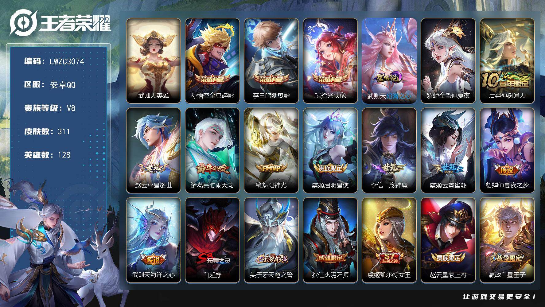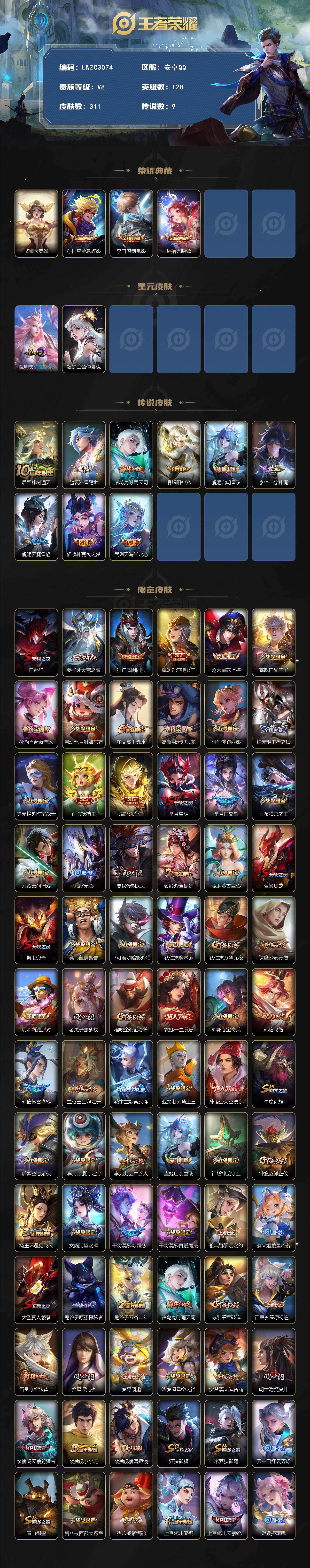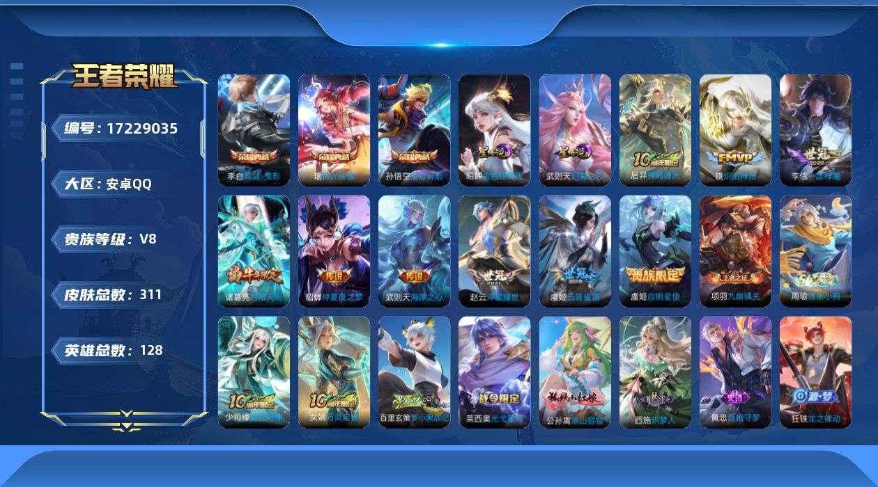 [17229035]【特价出售/店主推荐】1.1w小国刘禅、2市标、中路31段,安卓Q-V8-最强王者段位-128英雄-311皮肤-3典藏皮肤-1典藏英雄-2星传说-9传说-95史诗 【英雄全皮】:刘邦全皮,孙权全皮 【荣耀典藏】:武则天英雄,孙悟空全息碎影,李白鸣剑曳影,瑶拾光映像 【传说皮肤】:后羿神树通天,赵云淬星耀世,诸葛亮时雨天司,镜炽阳神光,虞姬启明星使,李信一念神魔,虞姬云霓雀翎,貂蝉仲夏夜之梦,武则天海洋之心 【限定皮肤】:白起狰,姜子牙天穹之誓,狄仁杰阴阳师,虞姬凯尔特女王,赵云皇家上将,嬴政白昼王子,孙尚香蔷薇恋人,鲁班七号狮舞东方,庄周高山流水,高渐离玩趣恶龙,阿轲迷踪丽影,钟无艳王者之锤,钟无艳超时空战士,孙膑妖精王,扁鹊炼金王,芈月重明,芈月白晶晶,吕布猎兽之王,元歌云间偶戏,元歌无心,夏侯惇朔风刀,甄姬游园惊梦,甄姬落雪兰心,曹操烛龙,典韦穷奇,典韦蓝屏警告,马可波罗暗影游猎,狄仁杰魔术师,狄仁杰万华元夜,达摩沙漠行僧,项羽海滩派对,老夫子醍醐杖,程咬金演武夺筹,露娜一生所爱,刘邦夺宝奇兵,韩信飞衡,韩信傲雪梅枪,兰陵王金庭之子,花木兰默契交锋,亚瑟潮玩骑士王,孙悟空大圣娶亲,牛魔御旌,后羿圣弓游侠,李元芳银河之约,李元芳云中旅人,虞姬启明星使,钟馗神迹守卫,钟馗驱傩正仪,杨玉环遇见飞天,女娲朔望之晖,干将莫邪冰霜恋舞曲,干将莫邪真爱魔法,雅典娜黎明之约,蔡文姬繁星吟游,太乙真人饕餮,鬼谷子原初探秘者,鬼谷子五谷丰年,诸葛亮时雨天司,苏烈千军破阵,百里玄策原初追逐者,百里守约朱雀志,弈星混沌棋,梦奇顽趣,沈梦溪星空之诺,沈梦溪大漠名商,明世隐疑决卦,裴擒虎天狼狩猎者,裴擒虎李小龙,裴擒虎擒涛扼浪,狂铁御狮,米莱狄御霄,云中君纤云弄巧,盾山御銮,猪八戒西部大镖客,猪八戒猪悟能,上官婉儿梁祝,上官婉儿天狼绘梦者,嫦娥拒霜思,嫦娥暖冬兔眠,鲁班大师探海日志,桑启海盐诗旅,暃星界游侠,张良古海寻踪,蒙恬荣光圣徽,鬼谷子天穹祈灯,沈梦溪龙舞盛年,刘邦剑破天穹,刘备异域游侠 【年限皮肤】:百里守约朱雀志,韩信飞衡,诸葛亮时雨天司 【赛季限定】:孙膑妖精王,扁鹊炼金王,虞姬凯尔特女王,白起狰,太乙真人饕餮,曹操烛龙,芈月重明,典韦穷奇,狂铁御狮,米莱狄御霄,牛魔御旌,盾山御銮,夏侯惇朔风刀,弈星混沌棋,明世隐疑决卦,老夫子醍醐杖,鬼谷子原初探秘者,狄仁杰万华元夜,程咬金