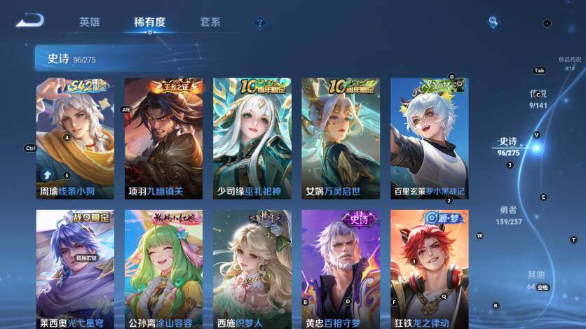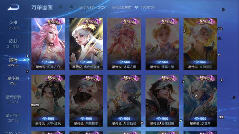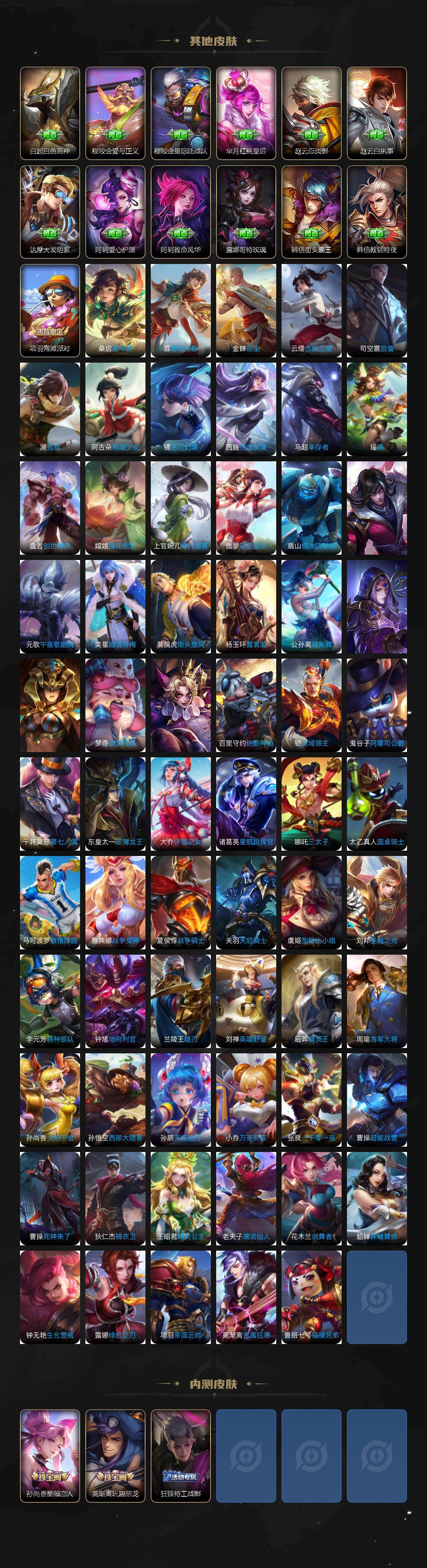 孙膑妖精王,扁鹊炼金王,虞姬凯尔特女王,白起狰,太乙真人饕餮,曹操烛龙,芈月重明,典韦穷奇,狂铁御狮,米莱狄御霄,牛魔御旌,盾山御銮,夏侯惇朔风刀,明世隐疑决卦,老夫子醍醐杖,鬼谷子原初探秘者,狄仁杰万华元夜,程咬金演武夺筹,钟馗驱傩正仪,苏烈千军破阵,吕布猎兽之王,嬴政白昼王子,女娲朔望之晖,典韦蓝屏警告,钟馗神迹守卫,鲁班七号狮舞东方,沈梦溪星空之诺,李元芳银河之约,刘邦夺宝奇兵,马可波罗暗影游猎,元歌云间偶戏,弈星混沌棋,达摩沙漠行僧,兰陵王金庭之子,沈梦溪大漠名商,李元芳云中旅人,桑启海盐诗旅,裴擒虎擒涛扼浪,鲁班大师探海日志,张良古海寻踪