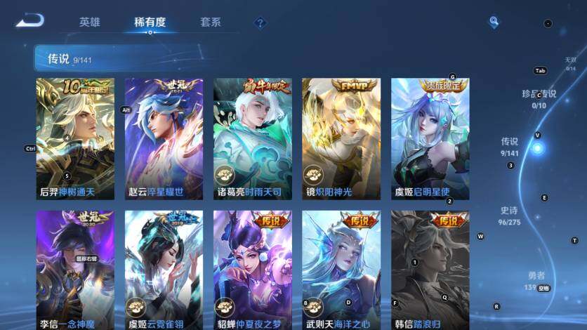 【传说皮肤】:后羿神树通天,赵云淬星耀世,诸葛亮时雨天司,镜炽阳神光,虞姬启明星使,李信一念神魔,虞姬云霓雀翎,貂蝉仲夏夜之梦,武则天海洋之心