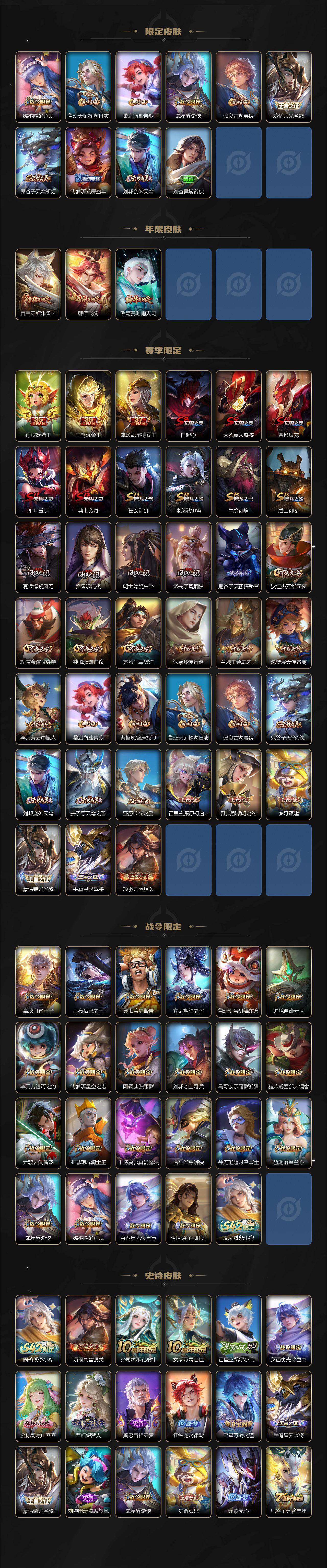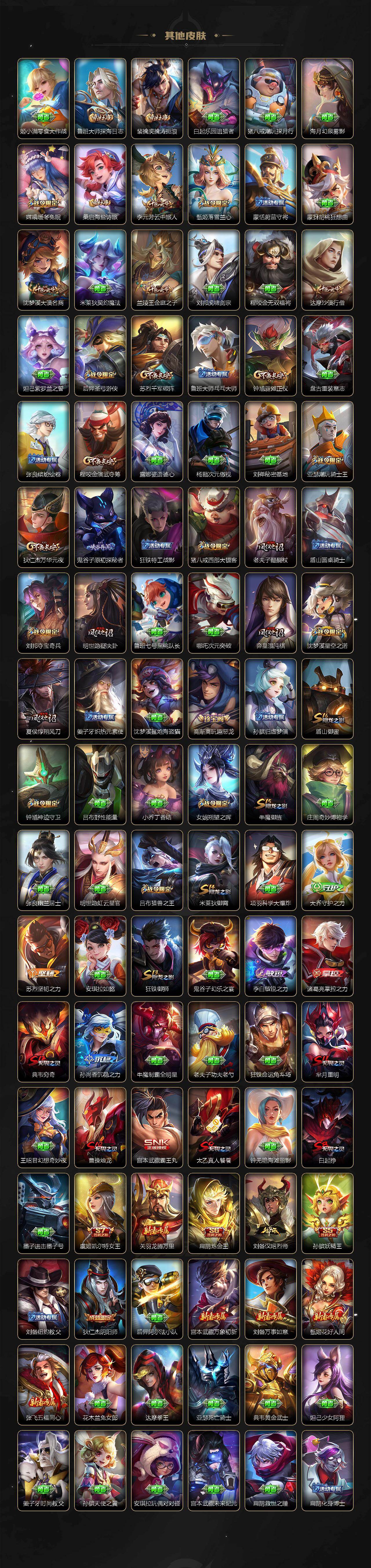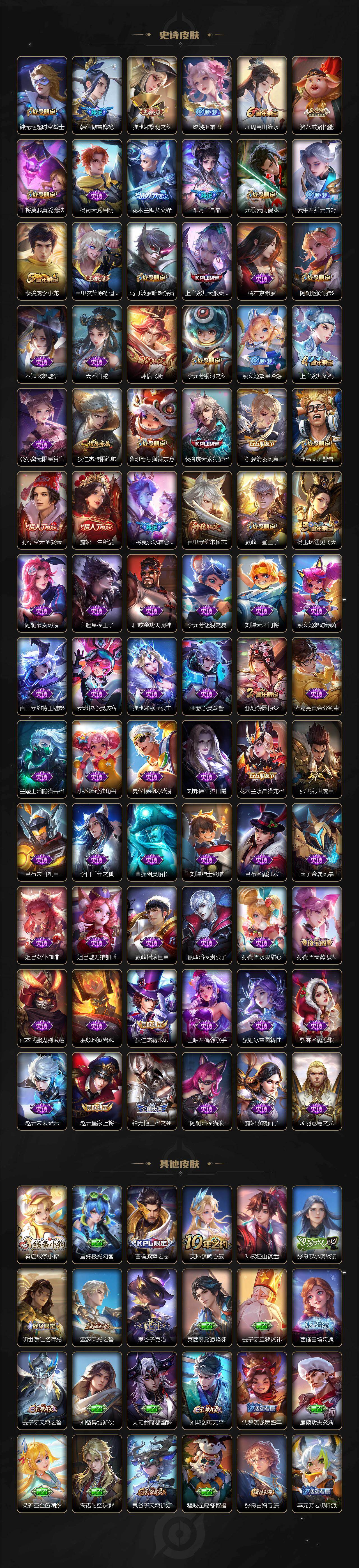 【限定皮肤】:白起狰,姜子牙天穹之誓,狄仁杰阴阳师,虞姬凯尔特女王,赵云皇家上将,嬴政白昼王子,孙尚香蔷薇恋人,鲁班七号狮舞东方,庄周高山流水,高渐离玩趣恶龙,阿轲迷踪丽影,钟无艳王者之锤,钟无艳超时空战士,孙膑妖精王,扁鹊炼金王,芈月重明,芈月白晶晶,吕布猎兽之王,元歌云间偶戏,元歌无心,夏侯惇朔风刀,甄姬游园惊梦,甄姬落雪兰心,曹操烛龙,典韦穷奇,典韦蓝屏警告,马可波罗暗影游猎,狄仁杰魔术师,狄仁杰万华元夜,达摩沙漠行僧,项羽海滩派对,老夫子醍醐杖,程咬金演武夺筹,露娜一生所爱,刘邦夺宝奇兵,韩信飞衡,韩信傲雪梅枪,兰陵王金庭之子,花木兰默契交锋,亚瑟潮玩骑士王,孙悟空大圣娶亲,牛魔御旌,后羿圣弓游侠,李元芳银河之约,李元芳云中旅人,虞姬启明星使,钟馗神迹守卫,钟馗驱傩正仪,杨玉环遇见飞天,女娲朔望之晖,干将莫邪冰霜恋舞曲,干将莫邪真爱魔法,雅典娜黎明之约,蔡文姬繁星吟游,太乙真人饕餮,鬼谷子原初探秘者,鬼谷子五谷丰年,诸葛亮时雨天司,苏烈千军破阵,百里玄策原初追逐者,百里守约朱雀志,弈星混沌棋,梦奇顽趣,沈梦溪星空之诺,沈梦溪大漠名商,明世隐疑决卦,裴擒虎天狼狩猎者,裴擒虎李小龙,裴擒虎擒涛扼浪,狂铁御狮,米莱狄御霄,云中君纤云弄巧,盾山御銮,猪八戒西部大镖客,猪八戒猪悟能,上官婉儿梁祝,上官婉儿天狼绘梦者,嫦娥拒霜思,嫦娥暖冬兔眠,鲁班大师探海日志,桑启海盐诗旅,暃星界游侠,张良古海寻踪,蒙恬荣光圣徽,鬼谷子天穹祈灯,沈梦溪龙舞盛年,刘邦剑破天穹,刘备异域游侠