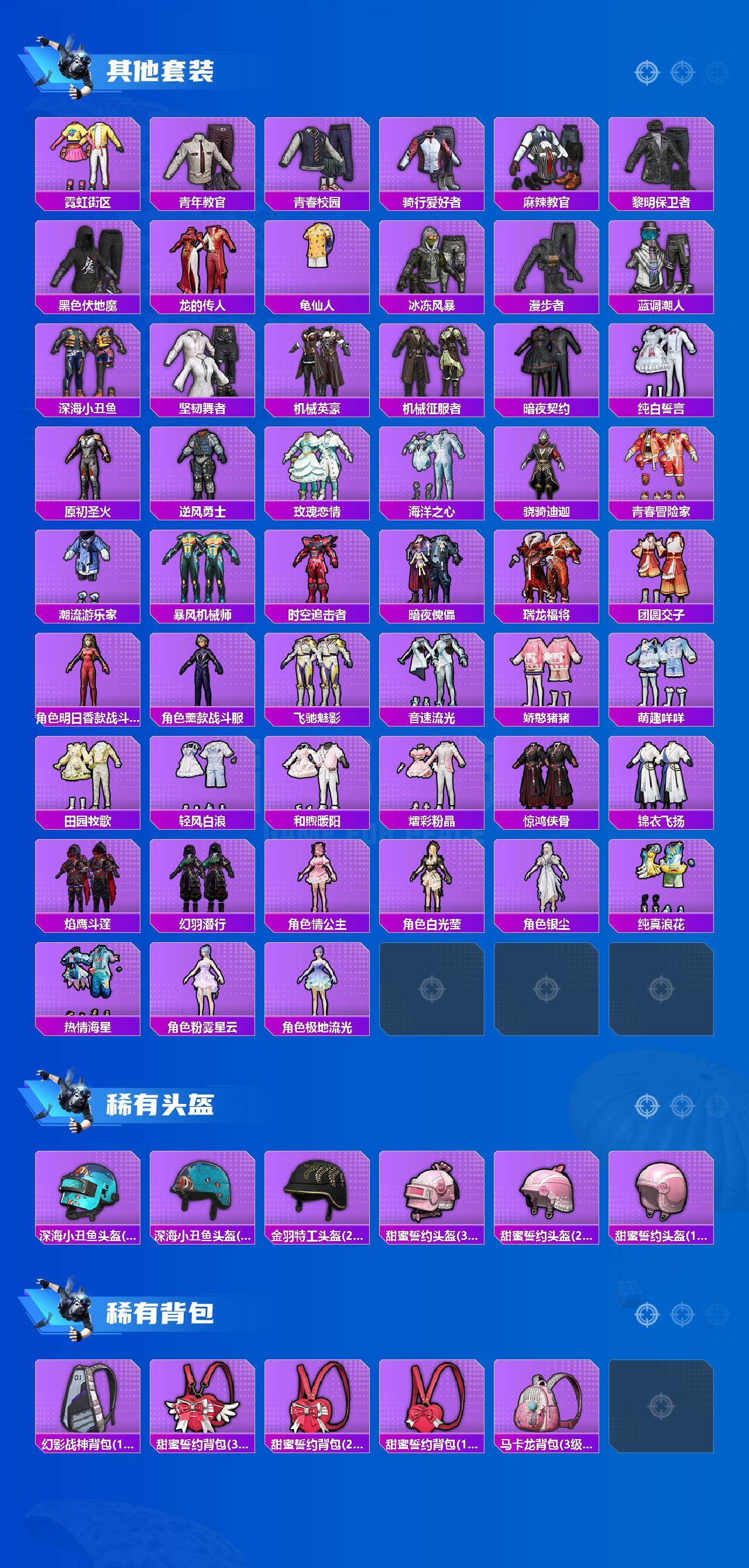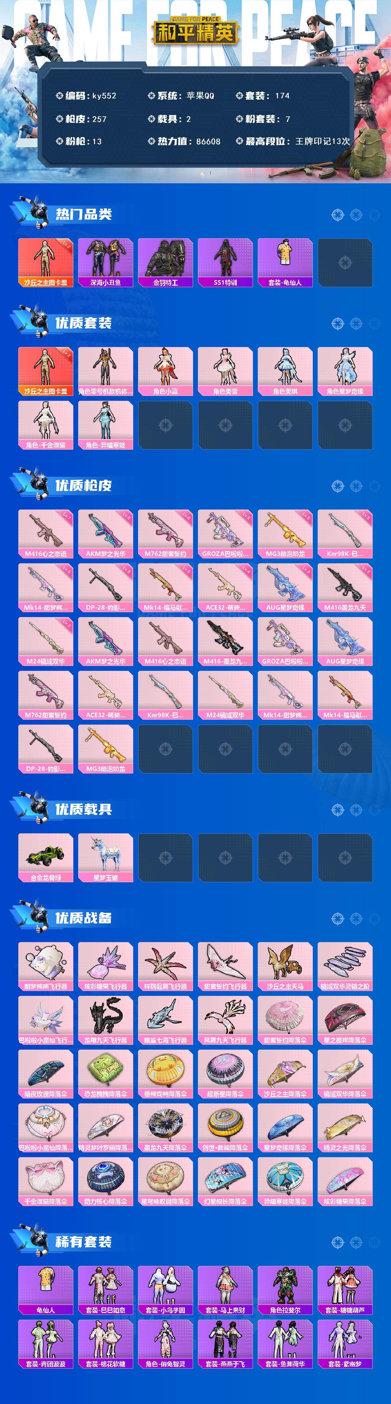 [17229030]苹果 手Q-1神装-7粉装-13特效枪-2载具-10粉色飞行器-86608热力值-13王牌印记-174套装-257枪皮 【红色神装等级】:沙丘之主-图卡盟(二级) 【红色角色神装】:沙丘之主-图卡盟 【热门品类】:套装-深海小丑鱼,套装-金羽特工,套装-SS1特训,套装-龟仙人 【粉色套装】:角色-零号机款机体服,角色-小蓝,角色-美雪,角色-美琪,角色-星梦奇缘,角色-千金淑猫,角色-异瞳寒姬 【粉色枪皮等级】:AKM-梦之光华(六级),M416-心之恋语(七级),M416-墨龙九天(三级),GROZA-巴啦啦小魔仙(五级),AUG-星梦奇缘(三级),M762-甜蜜誓约(六级),ACE32-萌骑漫游(四级),Kar98K-巳巳如意(五级),M24-镜域双华(三级),Mk14-甜梦熊击(五级),Mk14-福马献瑞(五级),DP-28-豹影疾电(五级),MG3-酷泡奶龙(五级) 【粉色载具】:合金龙骨(绿),星梦玉骢 【粉色枪皮】:AKM-梦之光华,M416-心之恋语,M416-墨龙九天,GROZA-巴啦啦小魔仙,AUG-星梦奇缘,M762-甜蜜誓约,ACE32-萌骑漫游,Kar98K-巳巳如意,M24-镜域双华,Mk14-甜梦熊击,Mk14-福马献瑞,DP-28-豹影疾电,MG3-酷泡奶龙 【粉色飞行器】:酣梦熊熊飞行器,炫彩糖果飞行器,祥瑞起舞飞行器,甜蜜誓约飞行器,沙丘之主天马,镜域双华-灵镜之阶,巴啦啦小魔仙飞行器,龙翔九天飞行器,脆鲨七海飞行器,凤舞九天飞行器 【粉色降落伞】:甜蜜誓约降落伞,星之彼岸降落伞,暗夜玫瑰降落伞,恐龙拽拽降落伞,垂柳戏鸭降落伞,超新星降落伞,沙丘之主降落伞,镜域双华降落伞,巴啦啦小魔仙降落伞,精灵梦叶罗丽降落伞,墨龙九天降落伞,创世·救赎降落伞,星梦奇缘降落伞,精灵之光降落伞,千金淑猫降落伞,动力核心降落伞,星穹咏叹调降落伞,幻星舰长降落伞,异瞳寒姬降落伞,炫彩糖果降落伞 【稀有套装】:套装-龟仙人,套装-巳巳如意,套装-小鸟芋圆,套装-雪国风尚,套装-炫彩糖果,套装-马上来财,角色-拉斐尔,套装-糖糖葫芦,套装-青团波波,套装-棉花软糖,角色-俏兔智灵,套装-燕燕于飞,套装-鱼渊荷华,套装-紫幽梦,套装-蓝冰羽,角色-瑰梦爱神,套装-极速光影,套装-云朵鹅,套装-雪绒豹,玩偶服-美羊羊 【稀有枪皮】:AKM-夜灯,AKM-彩虹