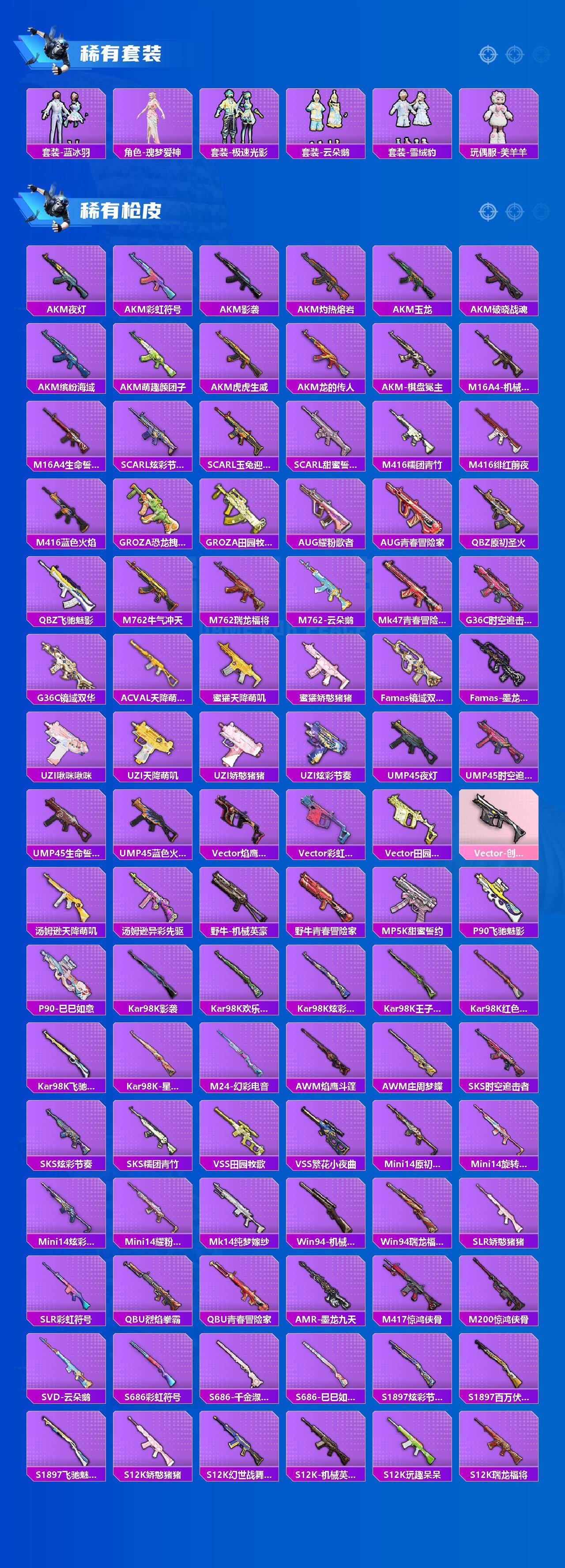 【粉色枪皮】:AKM-梦之光华,M416-心之恋语,M416-墨龙九天,GROZA-巴啦啦小魔仙,AUG-星梦奇缘,M762-甜蜜誓约,ACE32-萌骑漫游,Kar98K-巳巳如意,M24-镜域双华,Mk14-甜梦熊击,Mk14-福马献瑞,DP-28-豹影疾电,MG3-酷泡奶龙