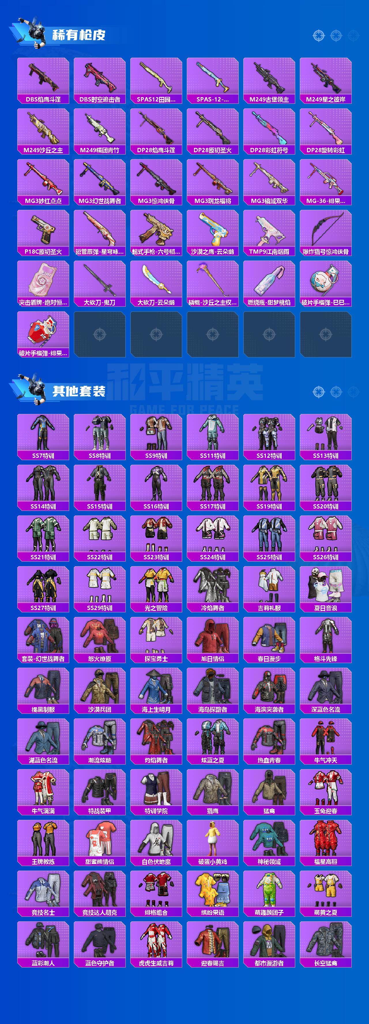 - PX_2090948- 苹果微信-18王牌印记-有战神框-7粉装-10特效枪-0载具-94481热力值-219套装-301枪皮-2卓越印记-1传奇印记 【7粉装】,放客神游,智耀战神,暗夜玫瑰,智能音符,宙之时溯,未来歌姬,烟云彩露 【10特效枪】AKM-绿萝繁花-5级 AKM-梦之光华-7级 SCAR-L-锦绣绵绵-5级 M416-五爪金龙-7级 GROZA-镜光银凌-5级 AUG-暖羊咩咩-5